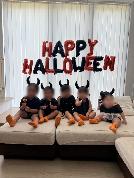 靴下はオレンジ、服はブラックで揃えて、子供たちの顔には猫ひげを書きました🐈