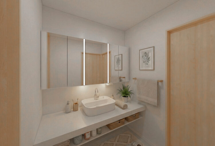 縦のライン照明が美しいミラーキャビネットは、顔映りを明るく照らし、朝の身支度を特別な時間に変えてくれます。