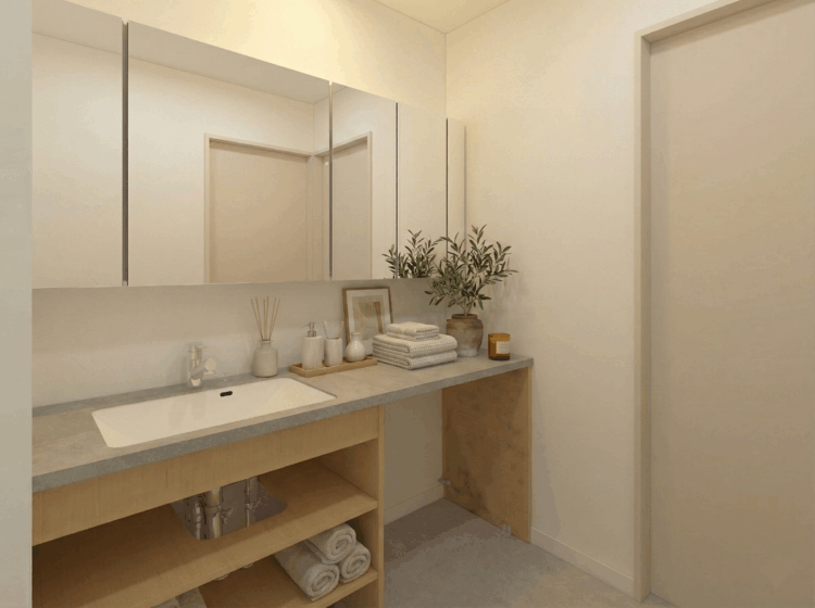 大きなミラーは顔映りを明るく照らし、朝の身支度を特別な時間に変えてくれます。