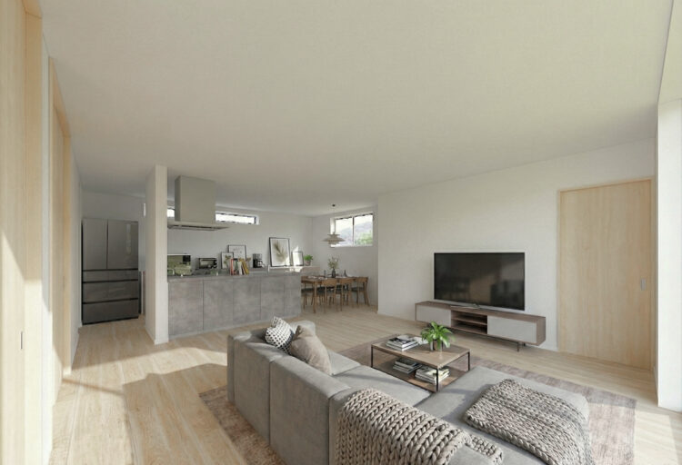 キッチンからリビング全体が見渡せ、いつでも家族の気配を感じられる「繋がり」のある空間。