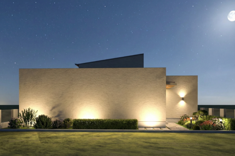 今回のお家は、グレージュの塗り壁が夜空に美しく映える、静かな佇まいの平屋。