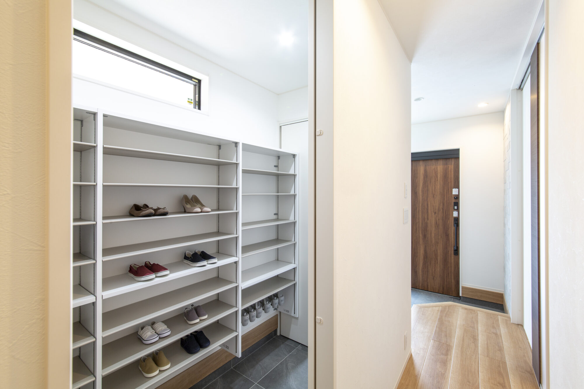 寝室とキッチンの間に通り抜けのできる「ウォークスルークローゼット」をつくりました(写真はキッチンからの視界。奥が寝室です)。ショートカットができるだけでなく、朝起きて、身支度して、LDKに行く、という生活スタイルに沿った動線になっています。ランドリールームとも近い場所にあるので、お洗濯物の収納作業もラクラク。通気がよいので湿気もたまりません。