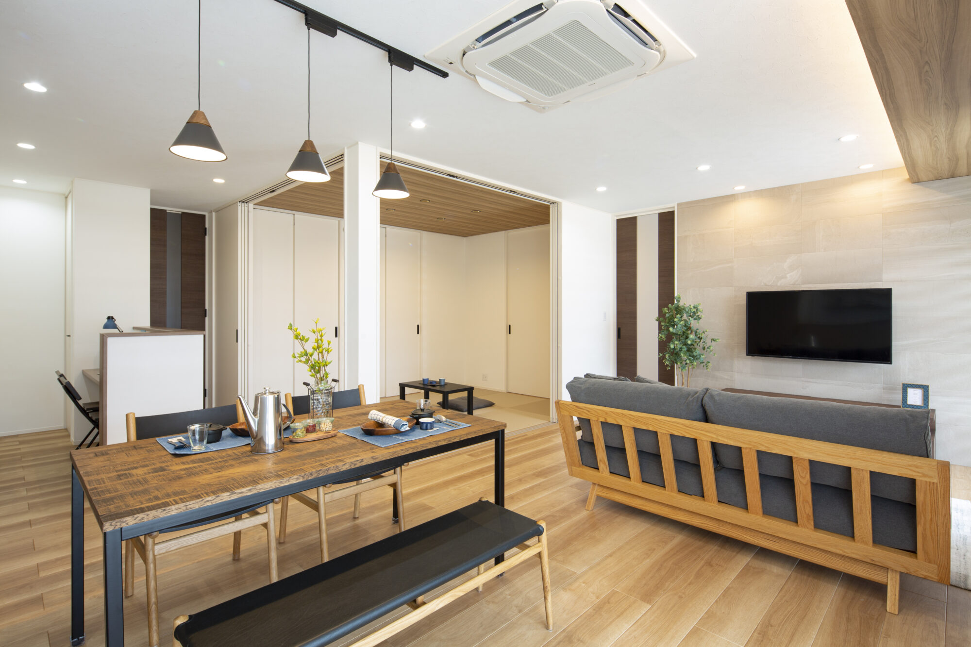 間仕切りに抜け感があるのでお部屋の一体感はそのまま。お客様をお迎えする畳の間も、普段は開け放しておけば開放感いっぱいです。お子様の遊び場にも、リラックススペースにももってこい。洋の建具やモダンな半畳タタミを使っているのでリビングインテリアとの相性もバッチリです。