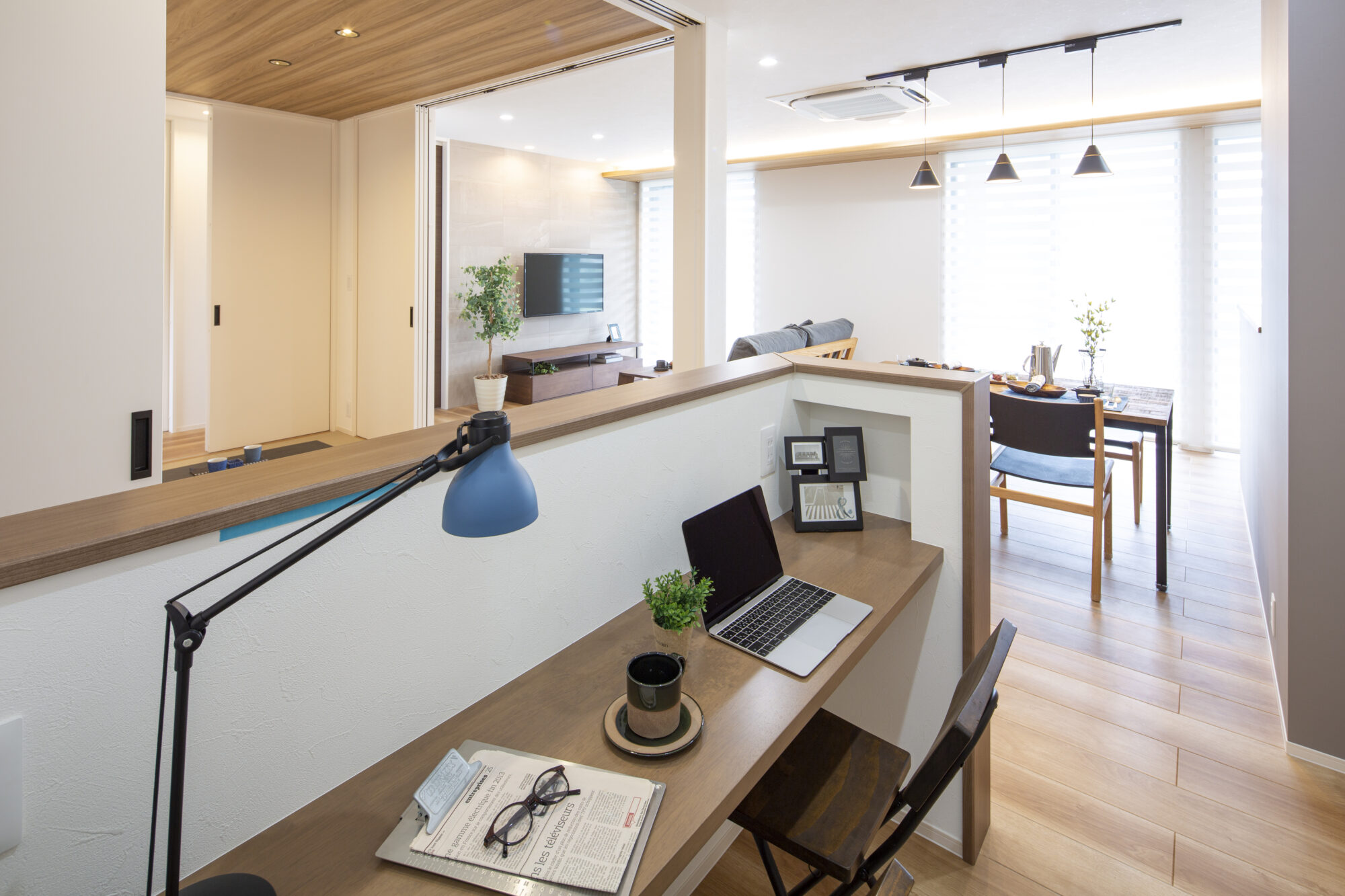 和室の奥に見えるのは書斎。いつでも家族が一緒にいられる間取りです。