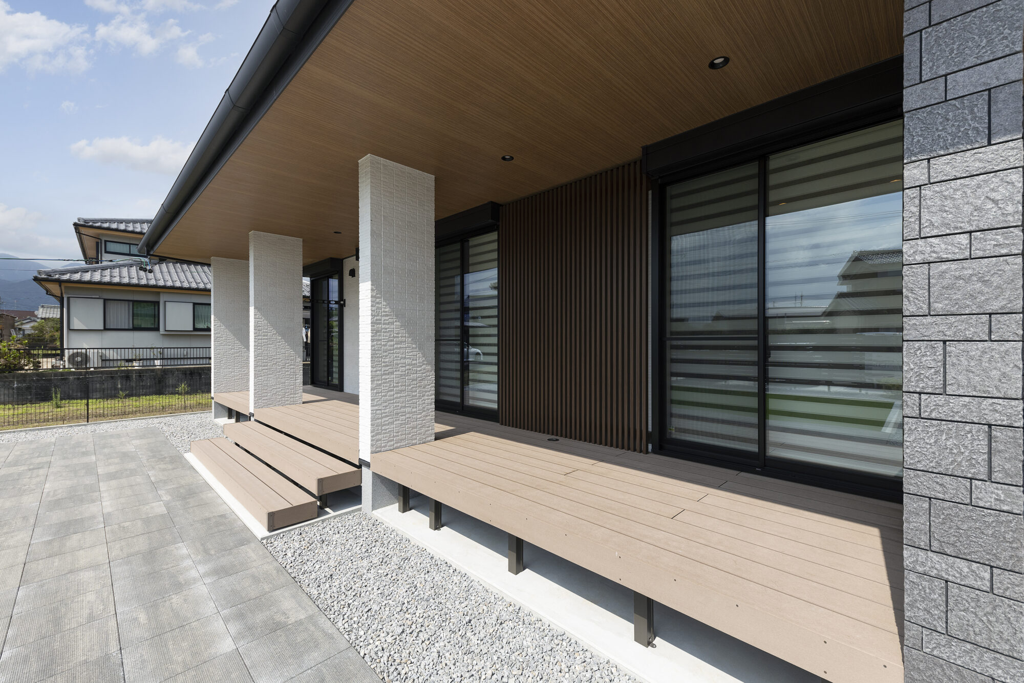 エクステリアは、ウッドデッキからコンクリートブロック、芝生のお庭へと続くぜいたくなつくり。バーベキュー、花火、おうちキャンプ、かけっこと、遊び方によって場所を選べます。これから家族揃っての楽しい体験がたくさん待っていそう!