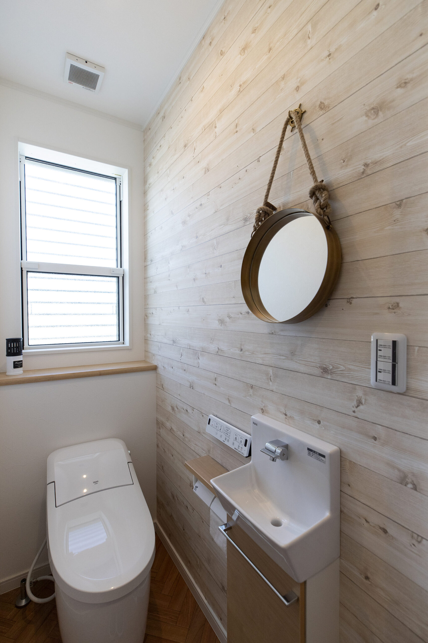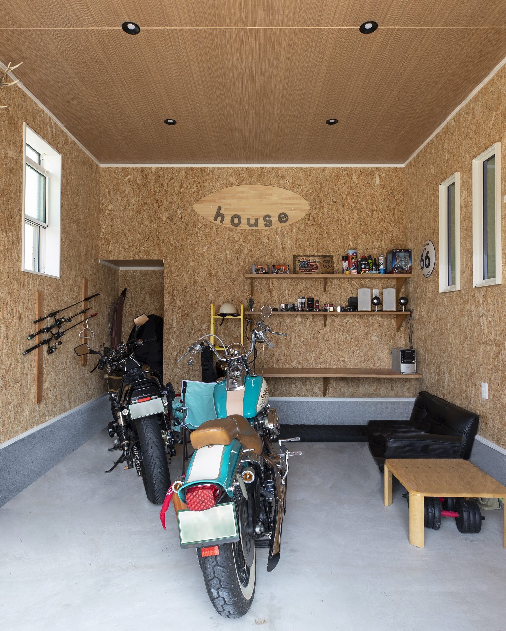 バイク、釣り、サーフィン、筋トレと、多趣味なご主人の夢をかなえたビルトインガレージ。プレスボードのかっこいい空間を、ホワイトの回り縁で爽やかに縁取っているのも西海岸スタイルです。シンプルな造作棚に並べられた工具まで、おしゃれなディスプレイに見えますね。オトナの秘密基地は使い始めてからが本当のお楽しみ。使い勝手のいいようにカスタマイズしたり、雑貨や小物を飾ったり、どんどん自分好みの空間になっていきます。