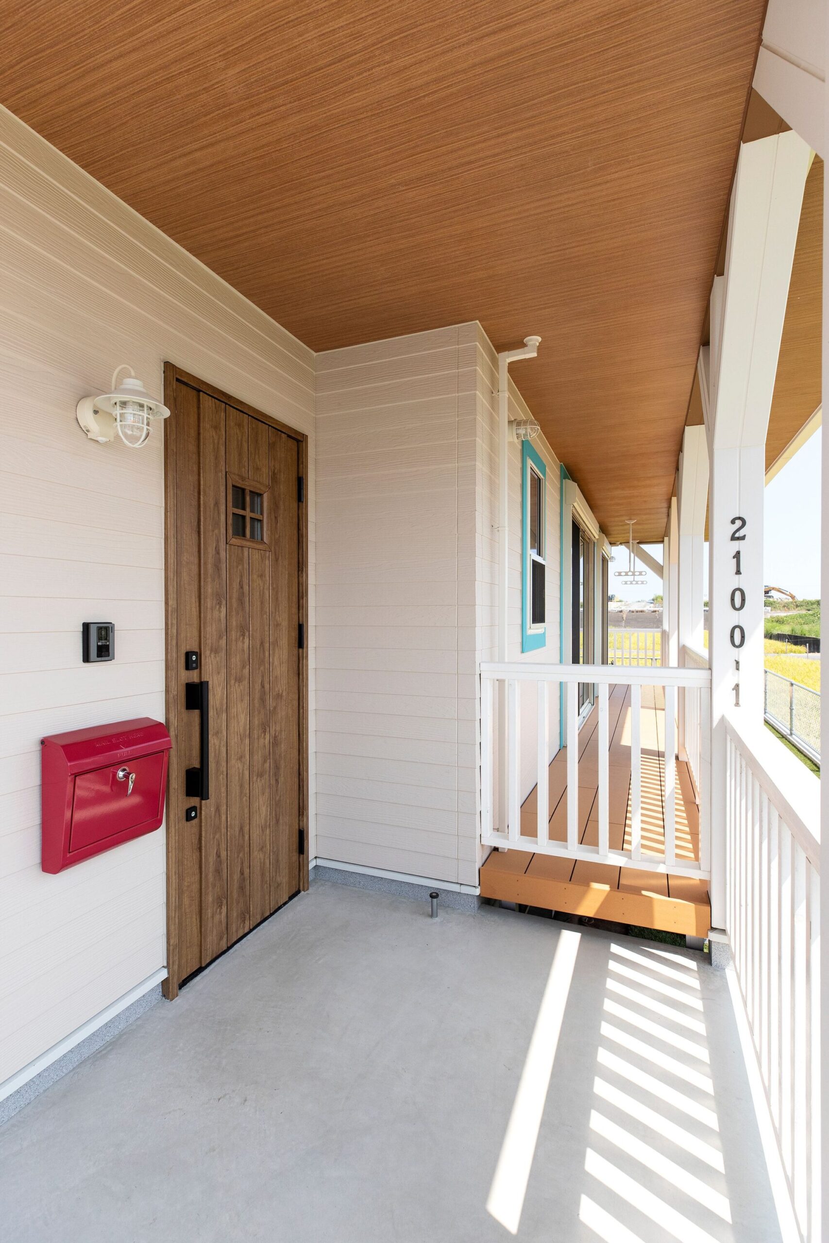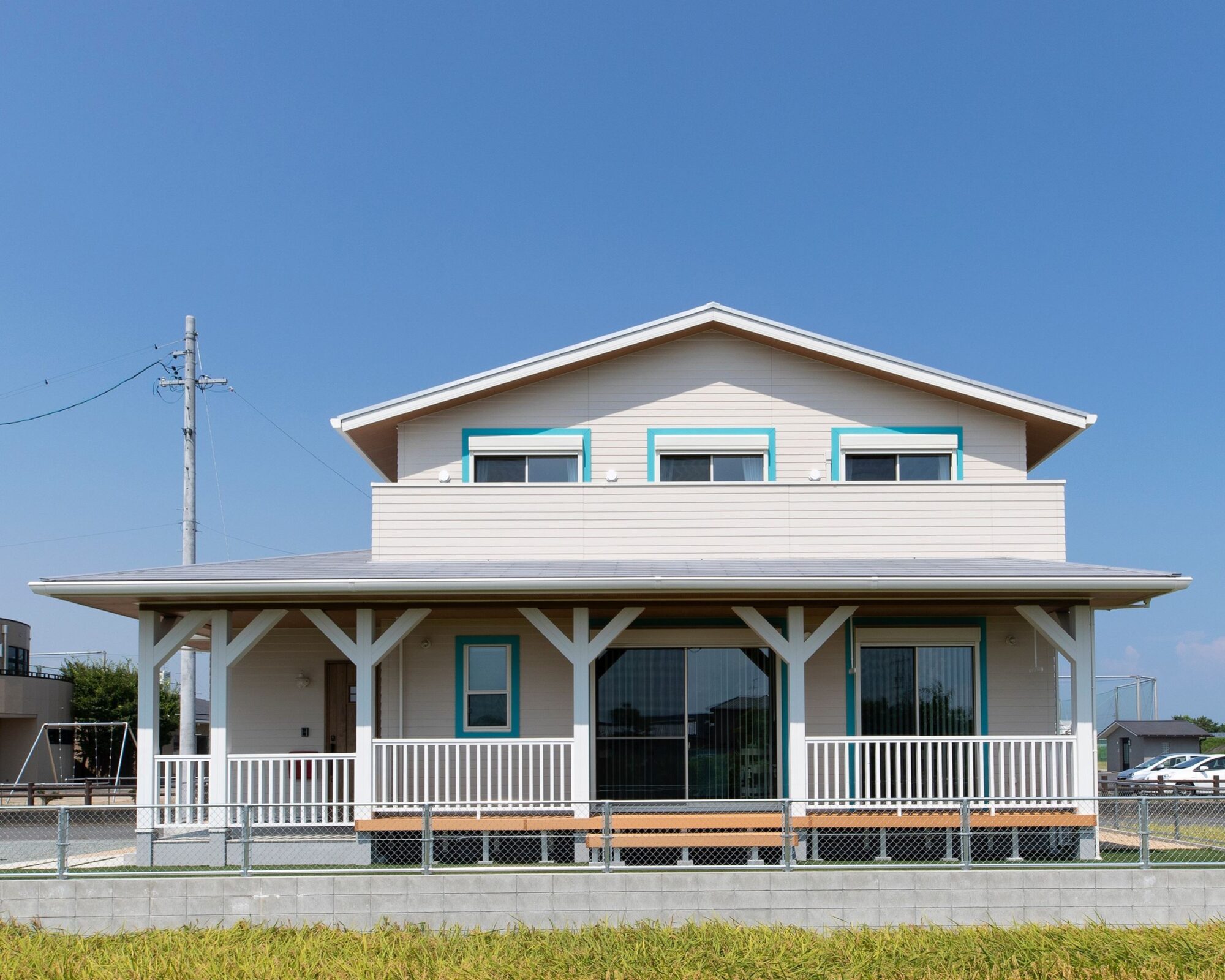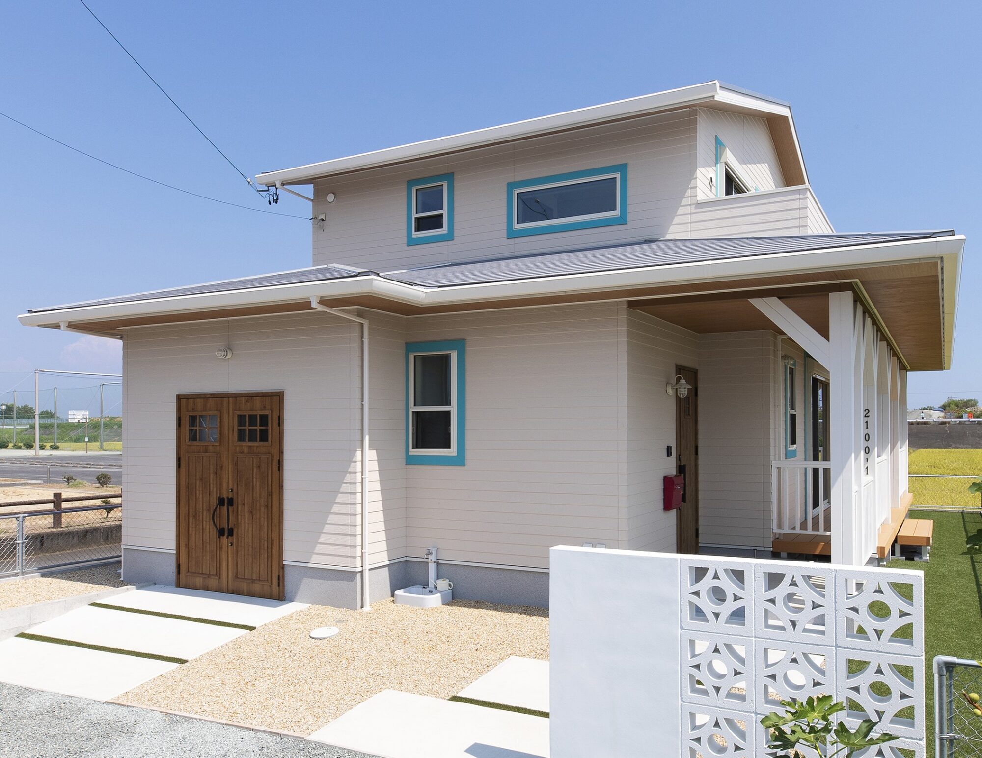 海、空、雲、白波を思わせるホワイト&ブルー! 爽やかな西海岸スタイルのアメリカンハウスです。シンボルはなんといってもビーチに向ってつくられる“カバードポーチ”。本場のスタイルにこだわって三角屋根の下にめいっぱいポーチを広げ、爽やかなデザインの支柱や手すりで開放感を演出しました。ティータイムを楽しんだり、ハンモックに揺られたりとアイデア次第で使い方は無限大。自然の風を感じながらくつろげる最高のリラックススペースです。他にもラップサイディングの外壁や、武骨なアメリカンフェンスなど、アメリカンハウスならではのワイルド&ナチュラルを堪能できます。