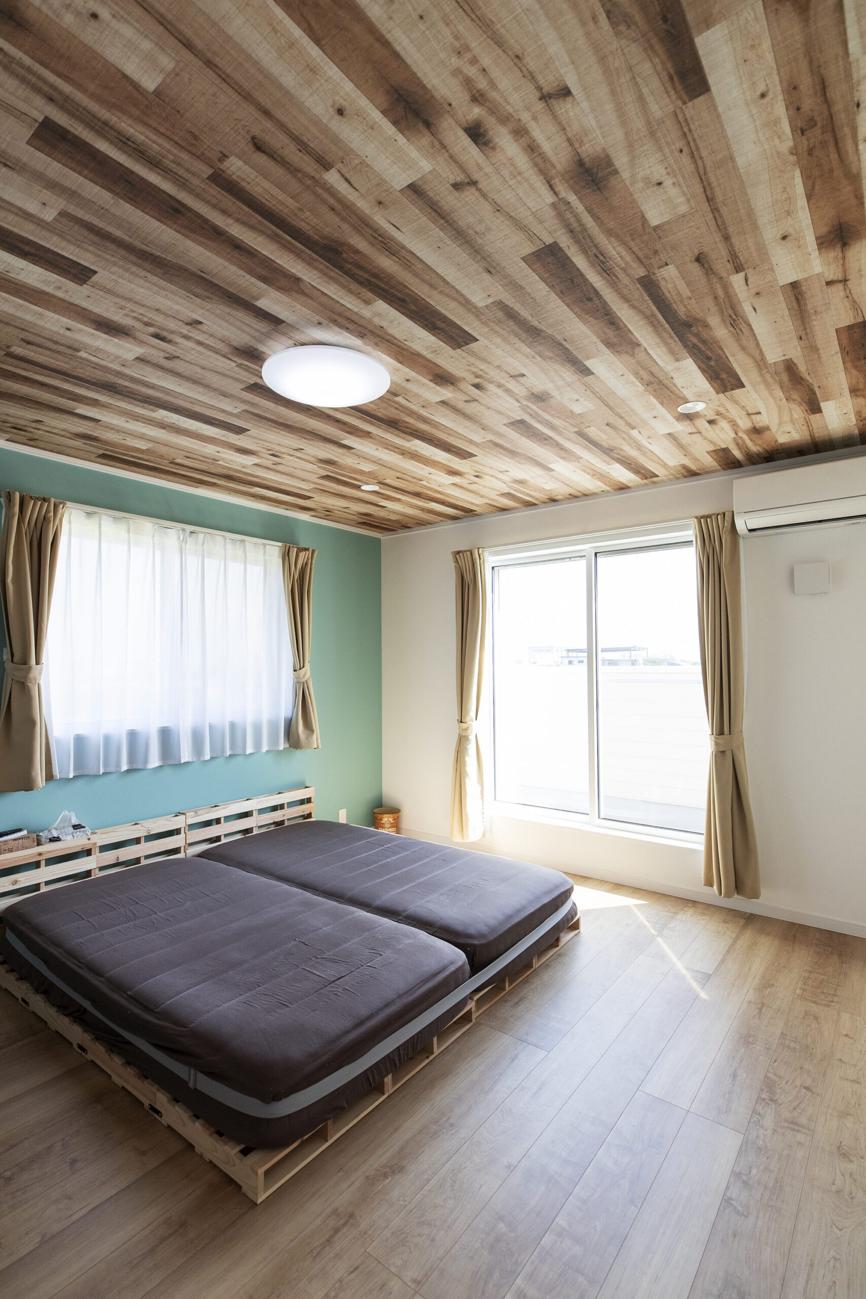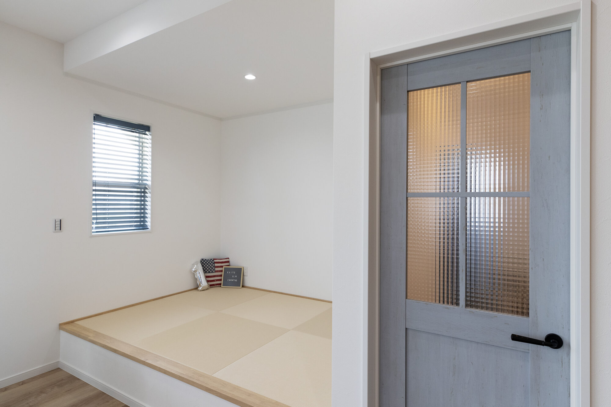 アメリカンスタイルといえども、畳の居心地のよさも味わいたいもの。そこで本格的な和室ではなく、くつろぎ重視の“畳コーナー”をつくりました。半畳タタミ、ダウンライト、ブラインドを使っておしゃれな洋間のスタイルに。型ガラスの入ったかわいらしい格子ドアとも相性ピッタリですね。扉をつけないオープンスタイルですが、小上がりの段差と折り下げ天井を利用して個室感を出しています。爽やかで開放的な癒やしの空間になりました。