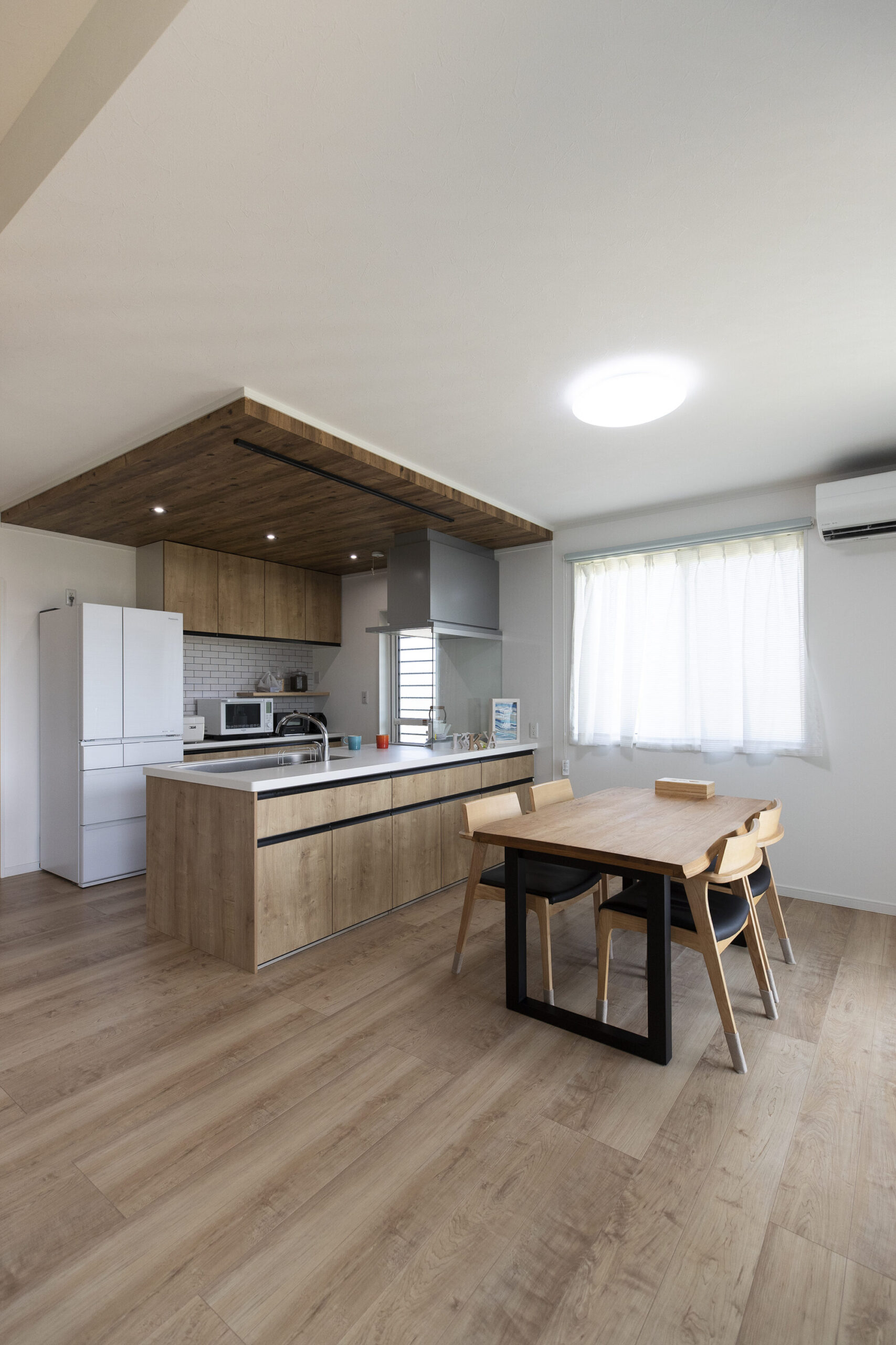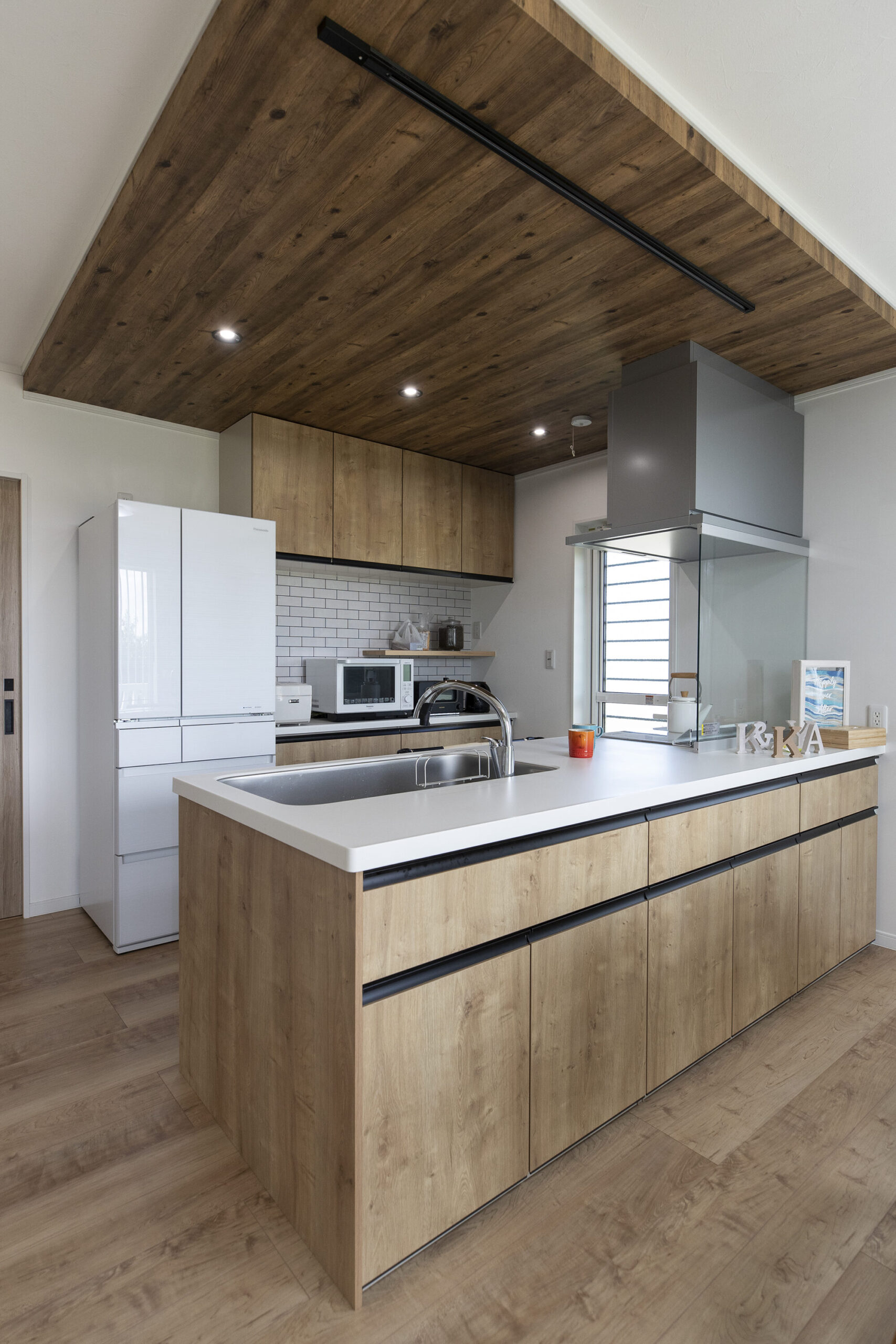 キッチンも爽やかな木目でトータルコーディネートしました。レンガ柄クロスのカジュアルっぽさ、ブラックのライティングレールの重厚感が、ナチュラルな空間の中でアクセントになっています。キッチンの上はおしゃれな折り下げ天井です。見た目がよいというだけでなく、オープンキッチンの開放感を損ねることなく、キッチンとダイニングを感覚的に間仕切りしているんですよ。キッチンの向きはもちろん外向き! カバードポーチ越しにワイドビューが楽しめます。