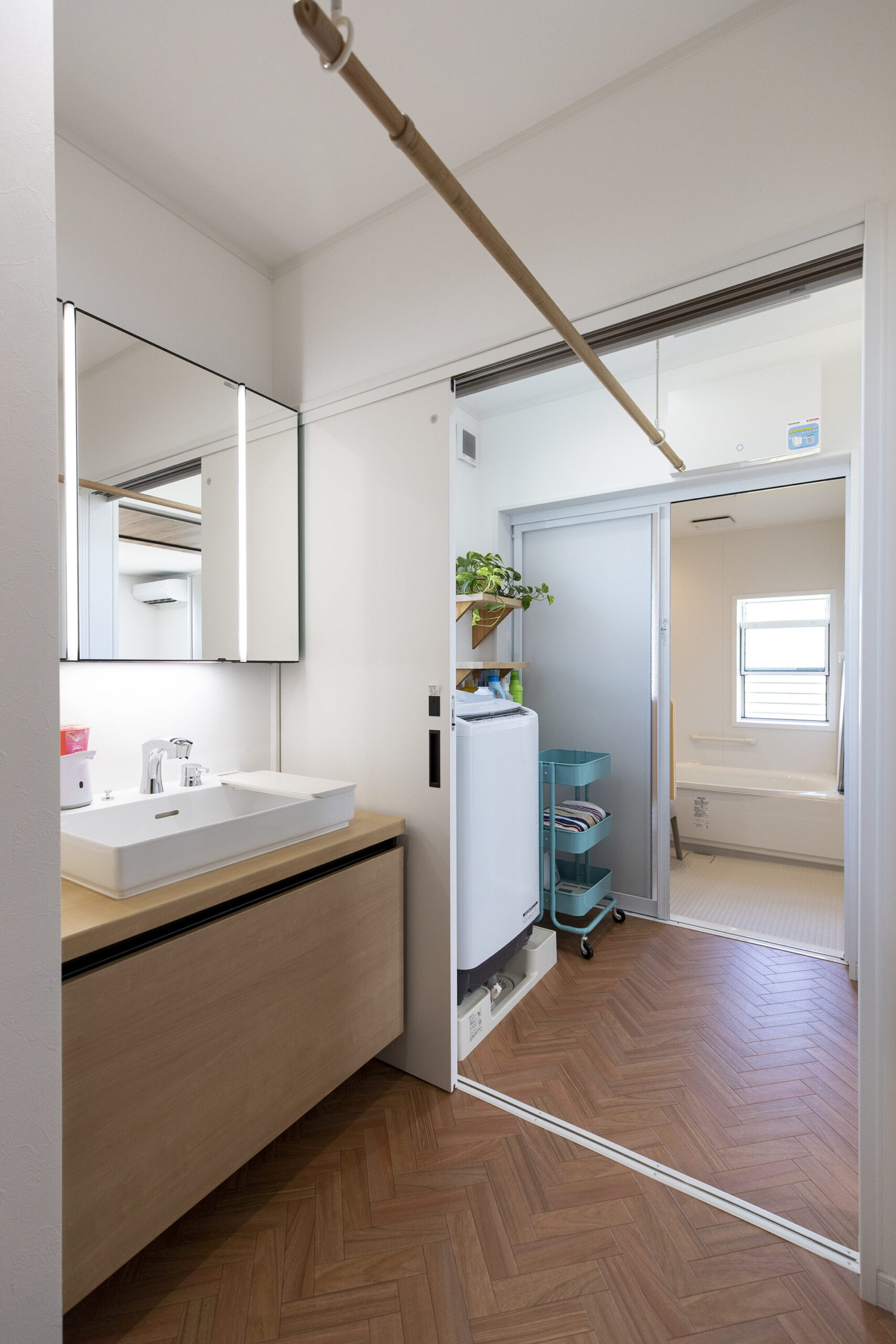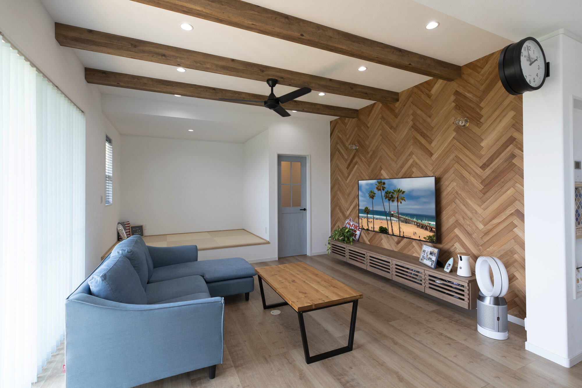 大胆なアクセントウォールです。寄木張りのひとつ、“ヘリンボーン”は床などに使われる人気の柄ですが、こんなふうに壁に使うととってもインパクトがありますね。天井の梁、木目の床、木製家具などいろんな種類の木目が目に楽しく、大自然を感じられる空間になりました。シーリングファンは西海岸スタイルのお家には欠かせないインテリアです。優雅に回転するプロペラはやさしい風を生み出し、ゆったりとした時間の流れをつくってくれます。