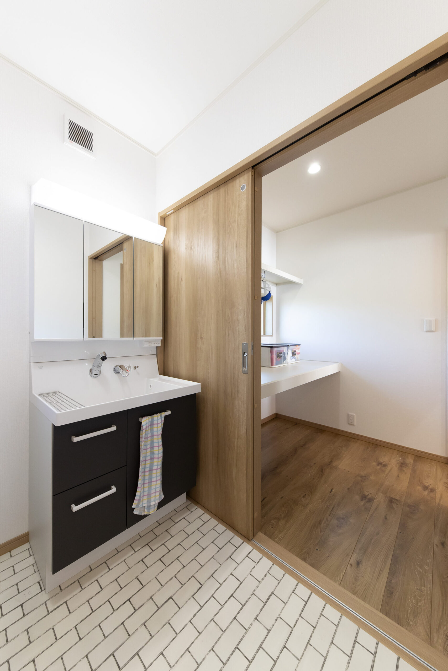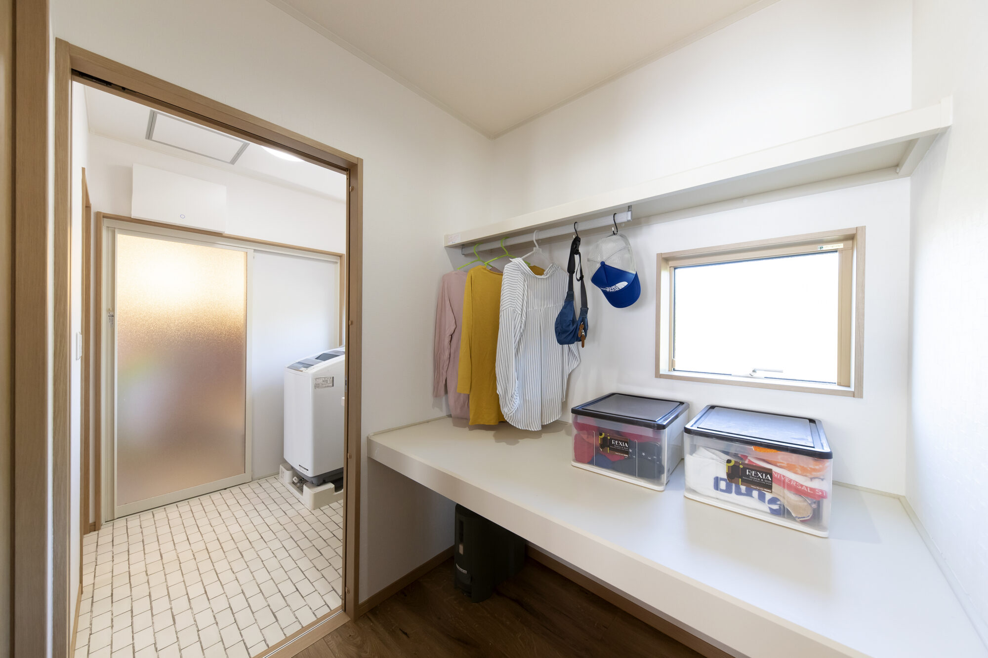 2階寝室のウォークインクローゼットとは別に、1階にみんなで使える大容量クローゼットを用意しました。キッチンと洗面脱衣所の間にあり、さらに洗面脱衣所から玄関まで抜けられる動線のよさ。お風呂上がりの衣類の取り出しに便利なだけでなく、お出かけアイテムの置き場所にすれば身支度をととのえる場所にもなります。2畳のゆったりサイズなので季節ものも余裕で収納できます。ウォークスルーなので空気がよどむ心配はなし。さらに滑り出し窓をつけたので明るさも通気も抜群です。