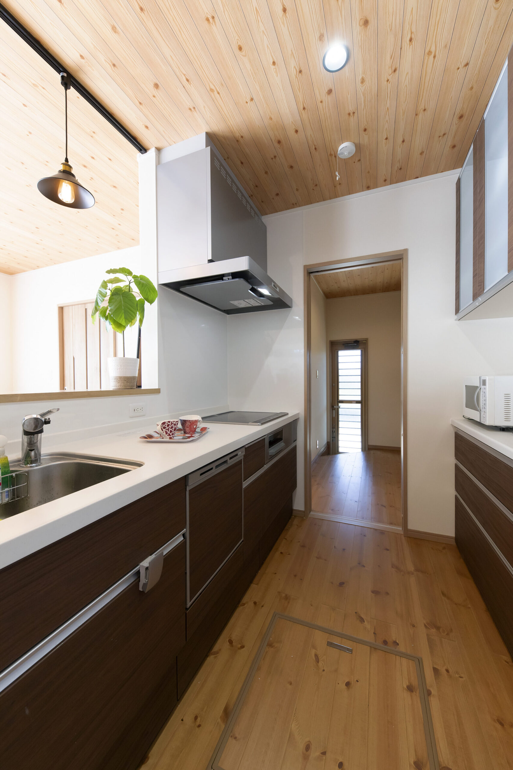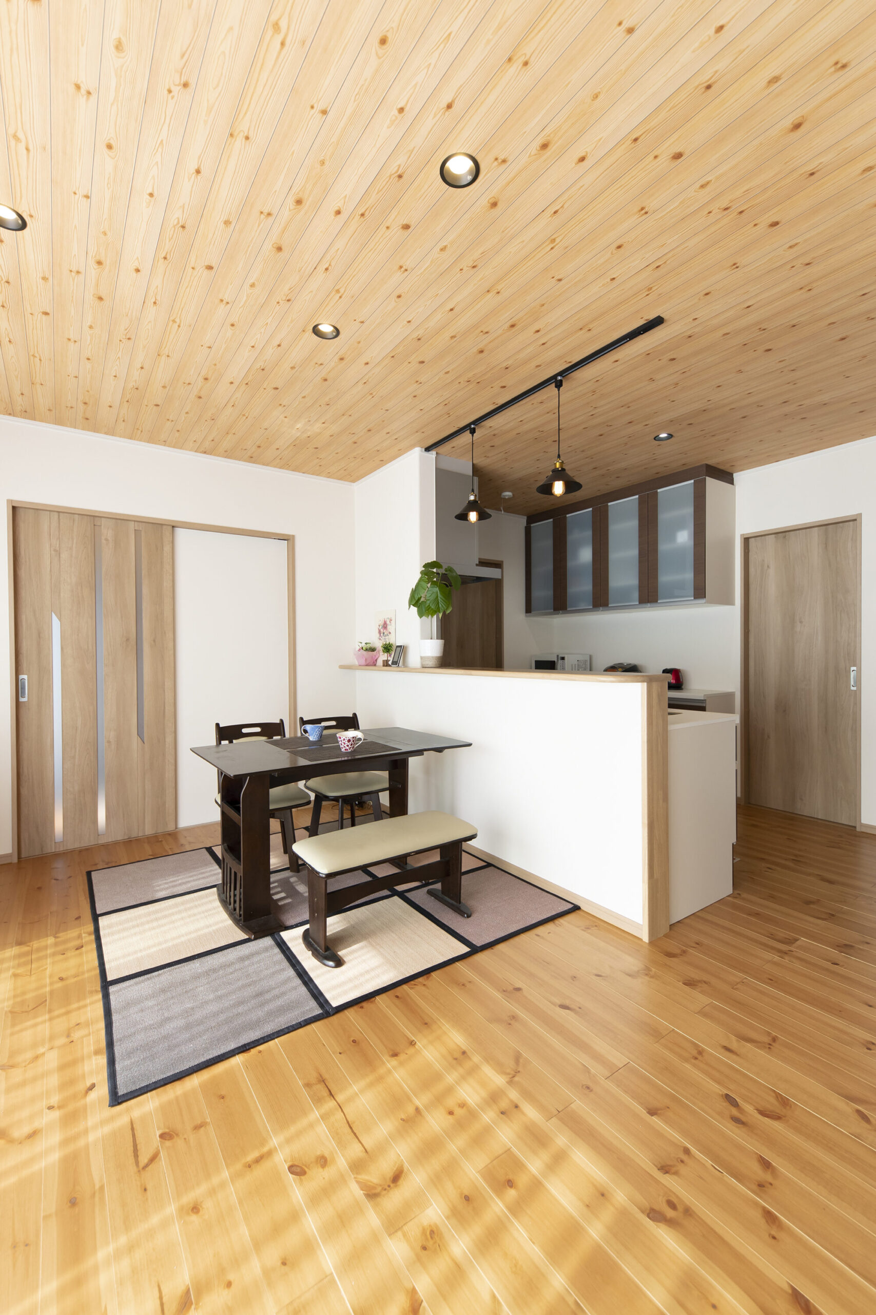 きれいな木目を眺めながらのお食事は気持ちがよいですね。ダイニングは、ダークブラウンのテーブルを置いて他とはひと味違うシックなテイストに。ペンダントライトや吊戸棚と色味を揃えて、お料理&お食事エリアとして一体感をもたせました。ダイニングテーブルの向きは、室内の出入りを邪魔しないよう、キッチンに対して垂直にレイアウト。キッチンとダイニングで視線を合わせやすいので、会話をしやすいというメリットもあります。