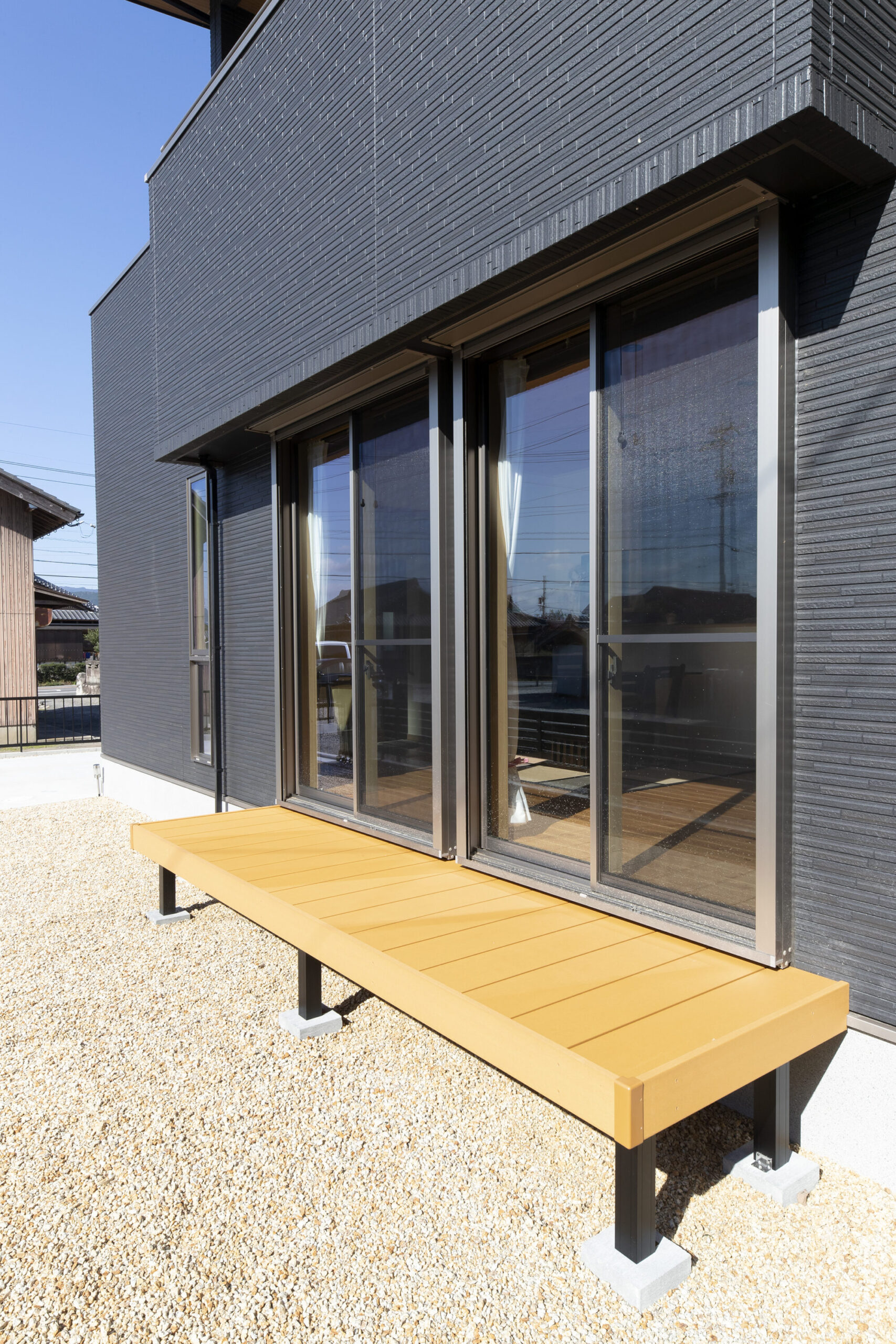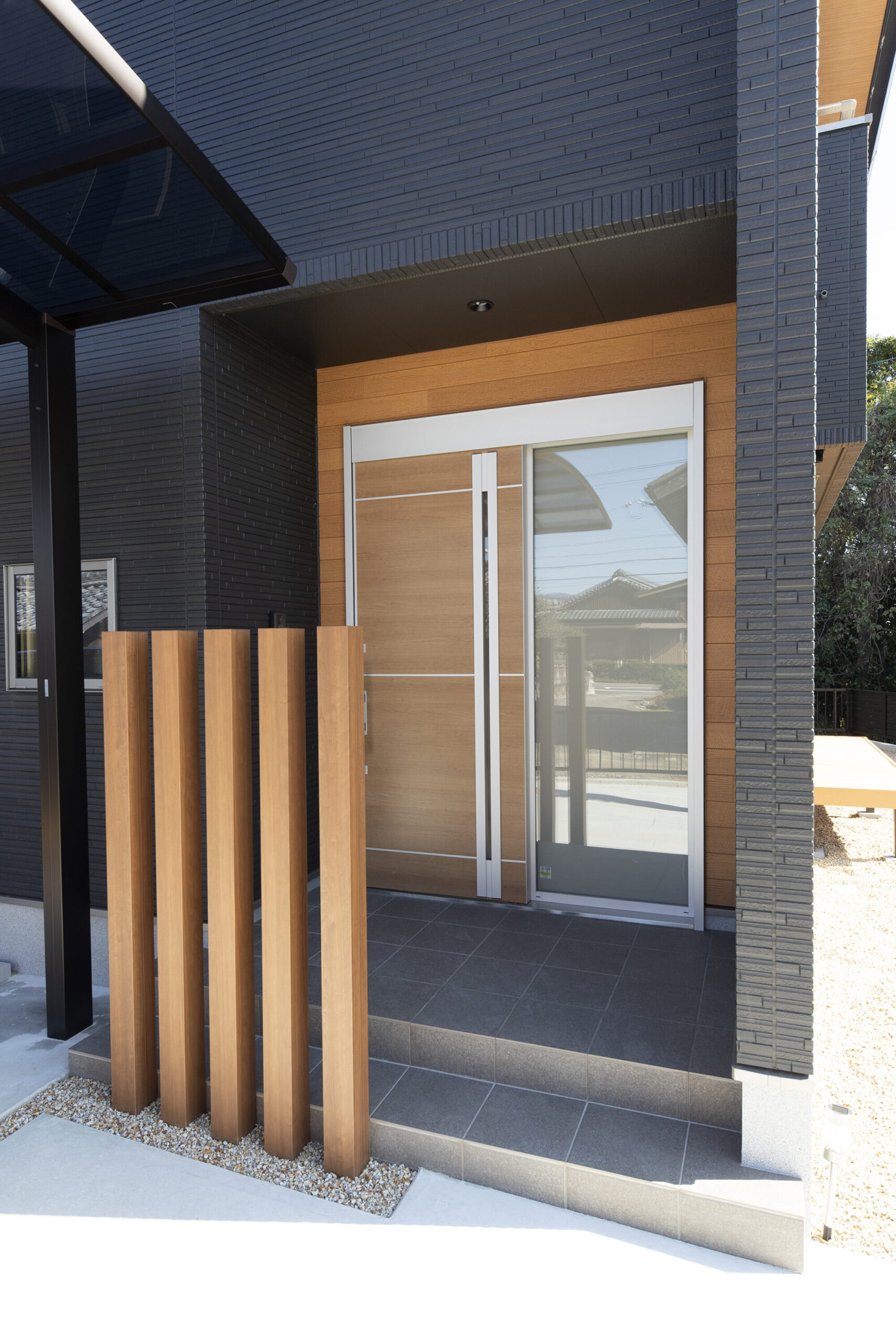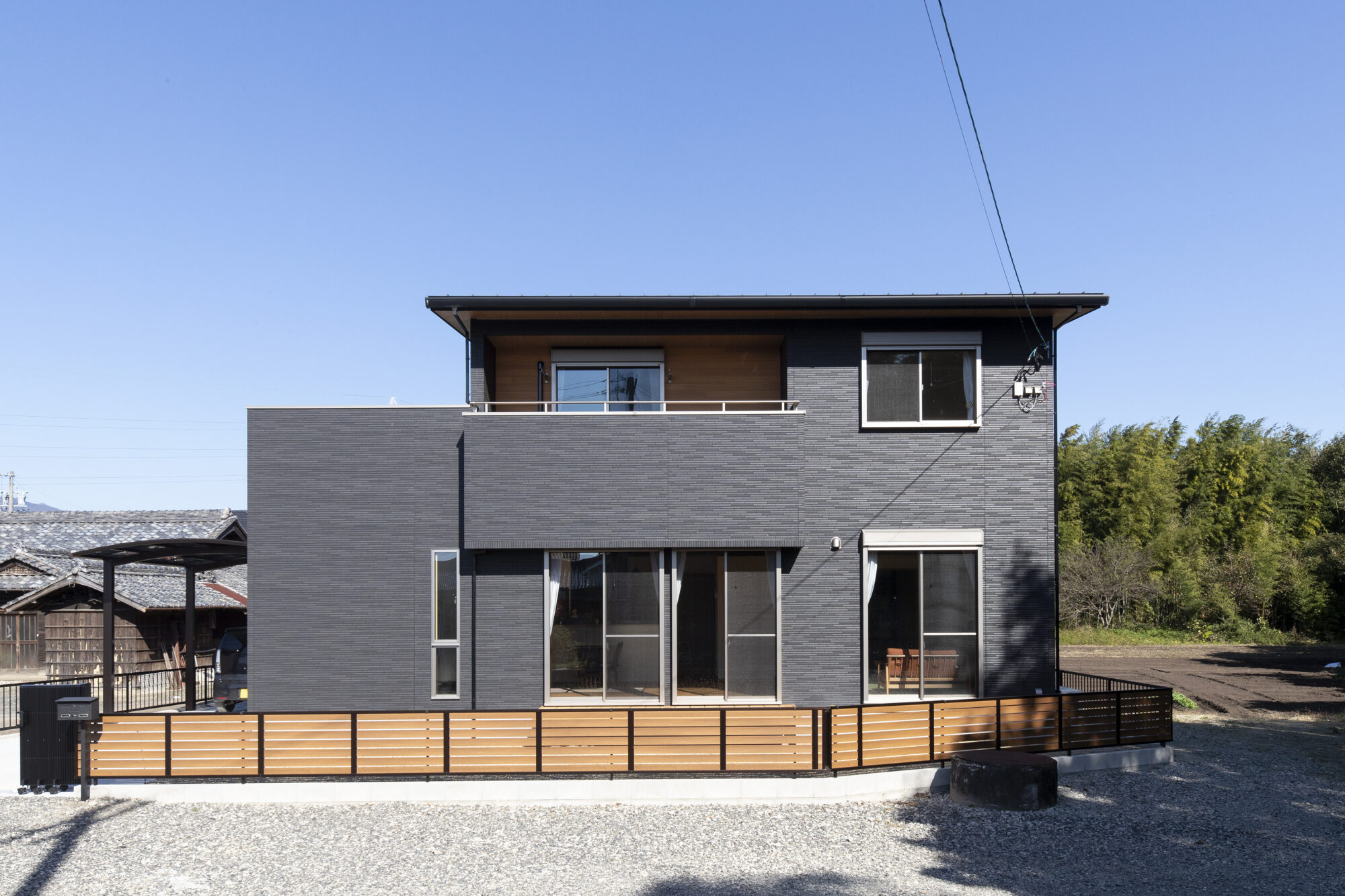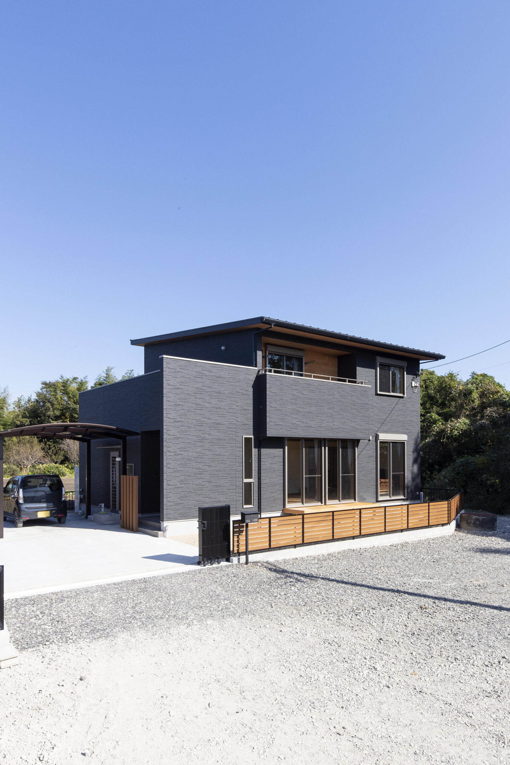 陽当たりに恵まれた絶好の立地! たっぷりの陽差しを浴びてブラックのタイルがキラキラと輝いています。スタイリッシュなブラックは、甘さを抑えた“男前スタイル”の定番カラーですが、自然豊かな環境になじむ色としても人気が高いんですよ。そんなブラックと木目の組みあわせが、こちらのお家のコンセプトカラー。フェンスやインナーバルコニーもしっかり合わせて統一感を出しました。モダンでありながら自然と調和する美しい外観です。