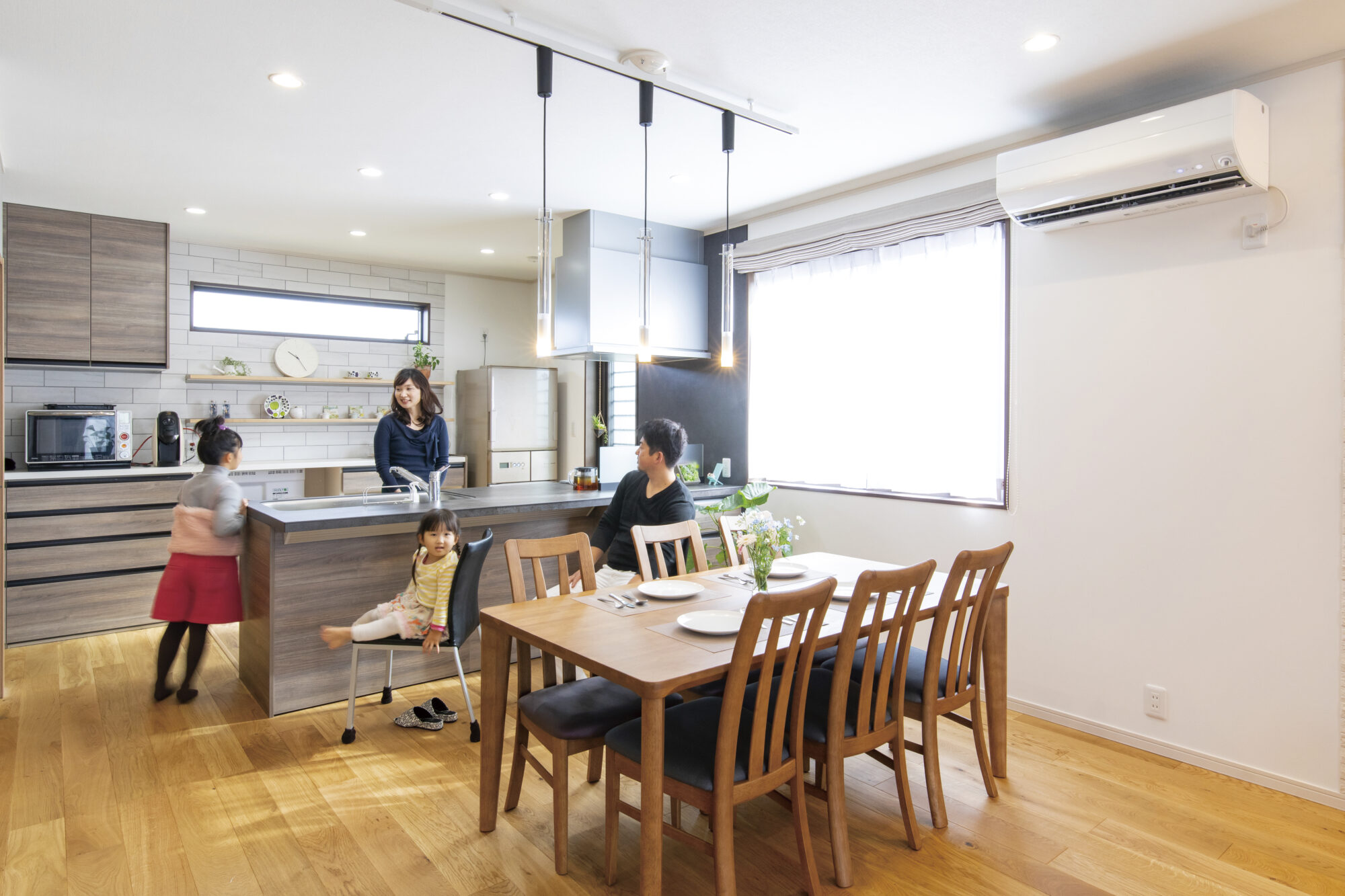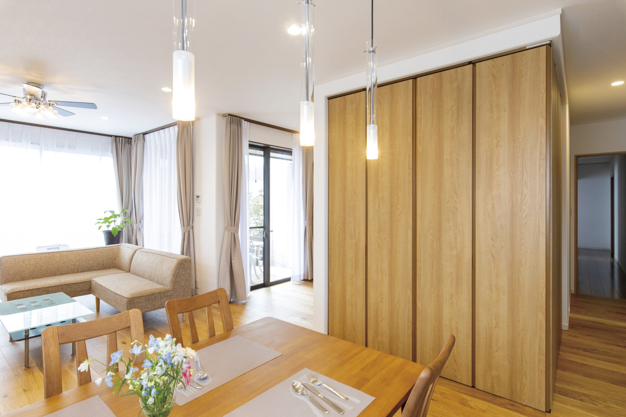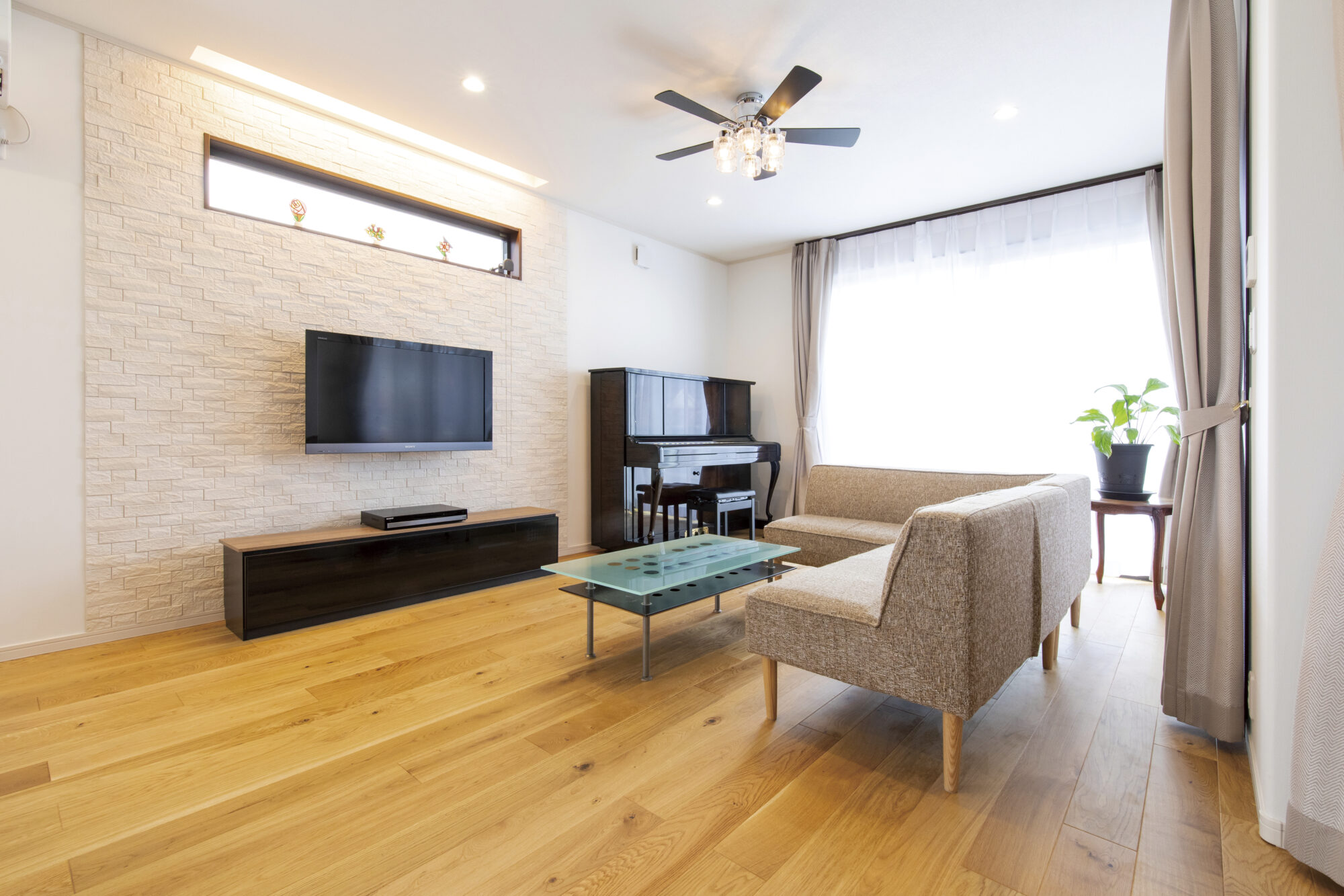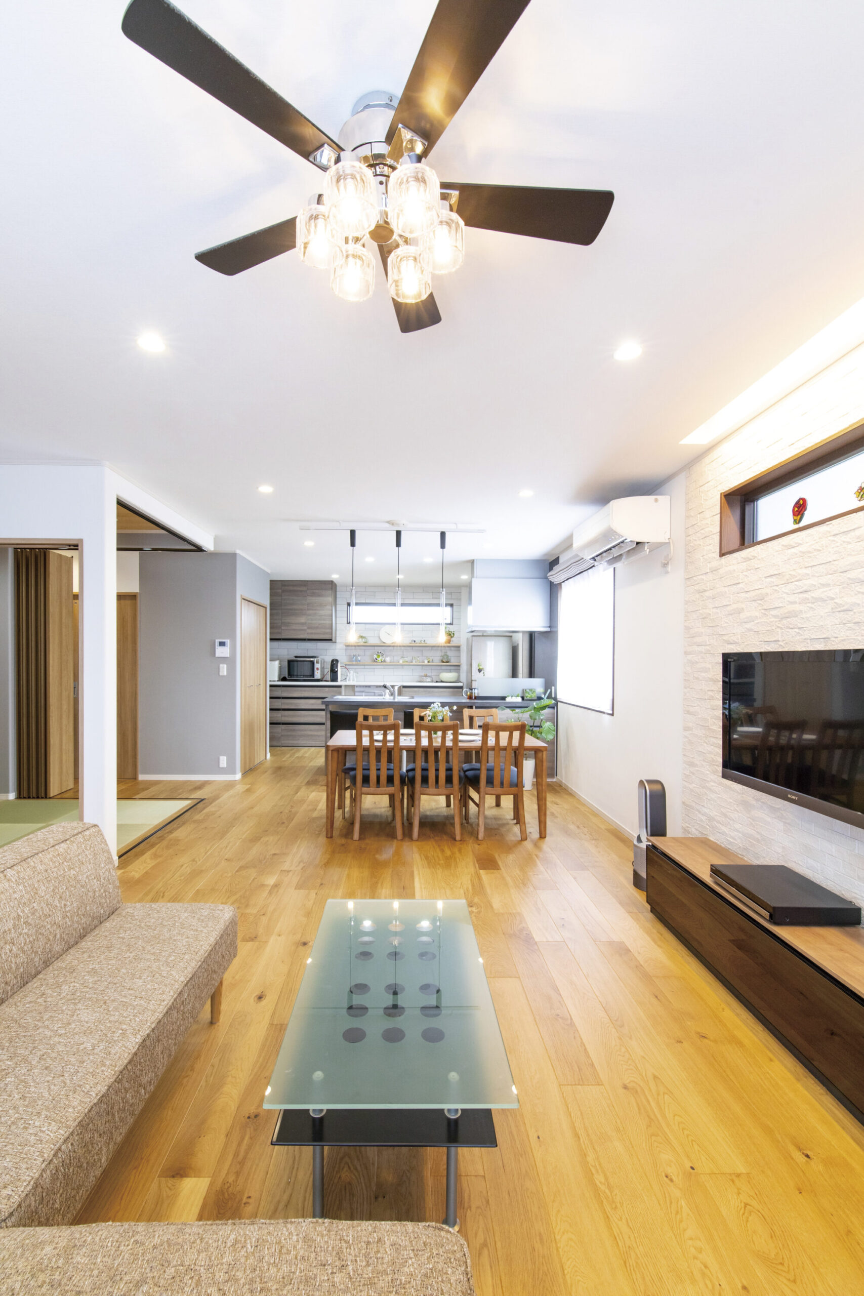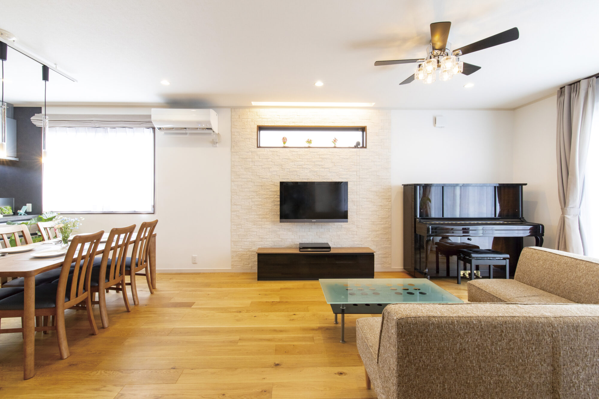 自然の木目が美しいナチュラルテイストのLDKです。床暖房を設置しているため、床材は、天然木の突板を貼ったフローリングをチョイスしました。天然木は見た目が美しいのはもちろんのこと、肌触りのよさも格別。夏も冬も裸足でくつろぎたいですね。LDKの広さは約25畳あります。キッチン、ダイニング、リビングと、それぞれの間を広く開けて人がスムーズに行き来できるようにしました。ソファの手前にはピアノもあるんですよ。ご家族がゆったり、にぎやかに過ごせるリビングです。