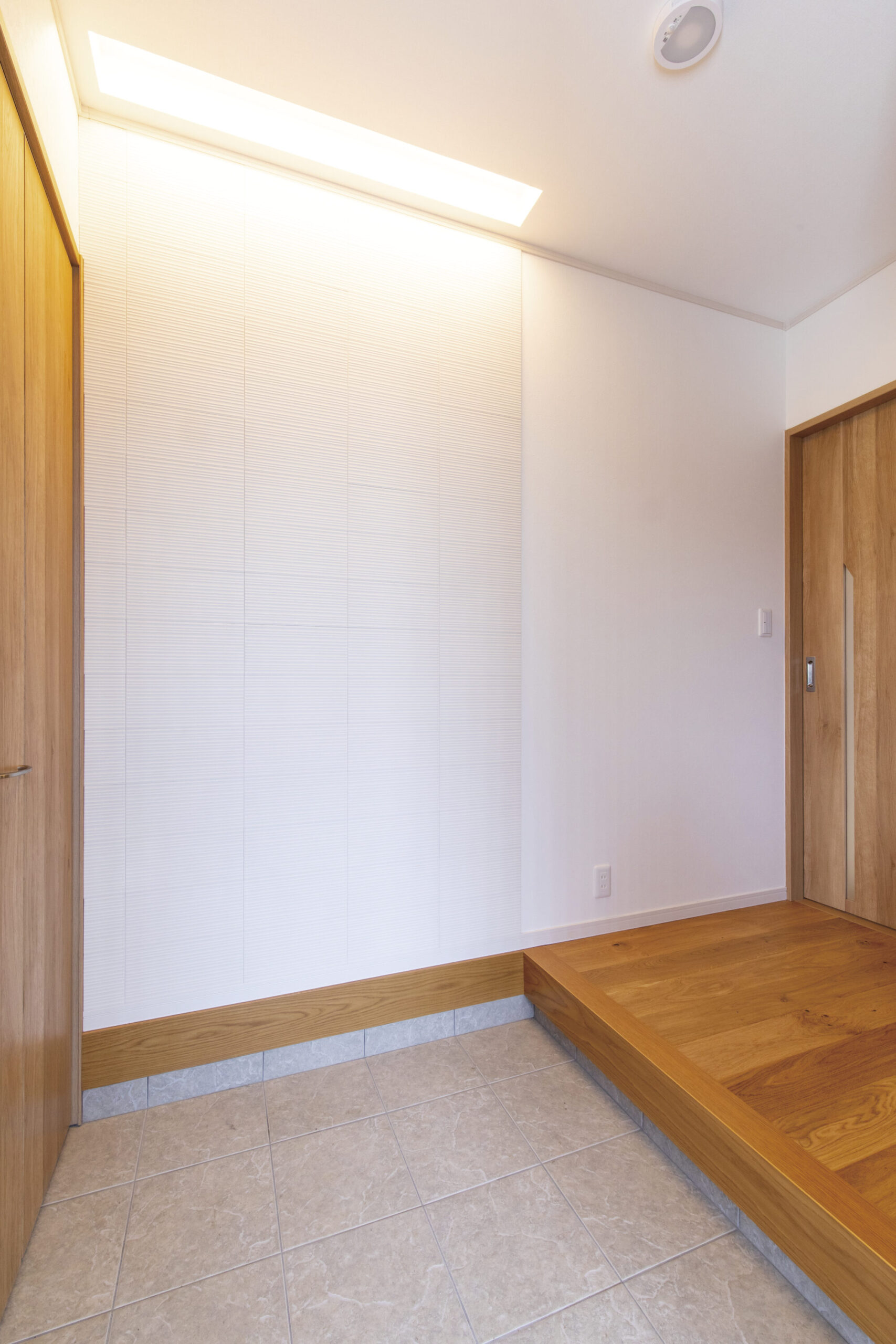 テレビの回りに意匠性の高いエコカラットをぜいたくに施工しました。パターンは、テレビの視聴を邪魔しない穏やかな色合いのタイル柄。すぐ上の採光窓から光が入り、ナチュラルな質感がより美しく表現されています。夜はダウンライトを当ててムーディーに。シーリングファンライトの光とともにしっとりとした空間をつくりあげます。ちなみに、壁掛けテレビでもエコカラットの施工は可能です。あらかじめ取り付け金具のまわりだけエコカラットを空けておくなどして対処します。