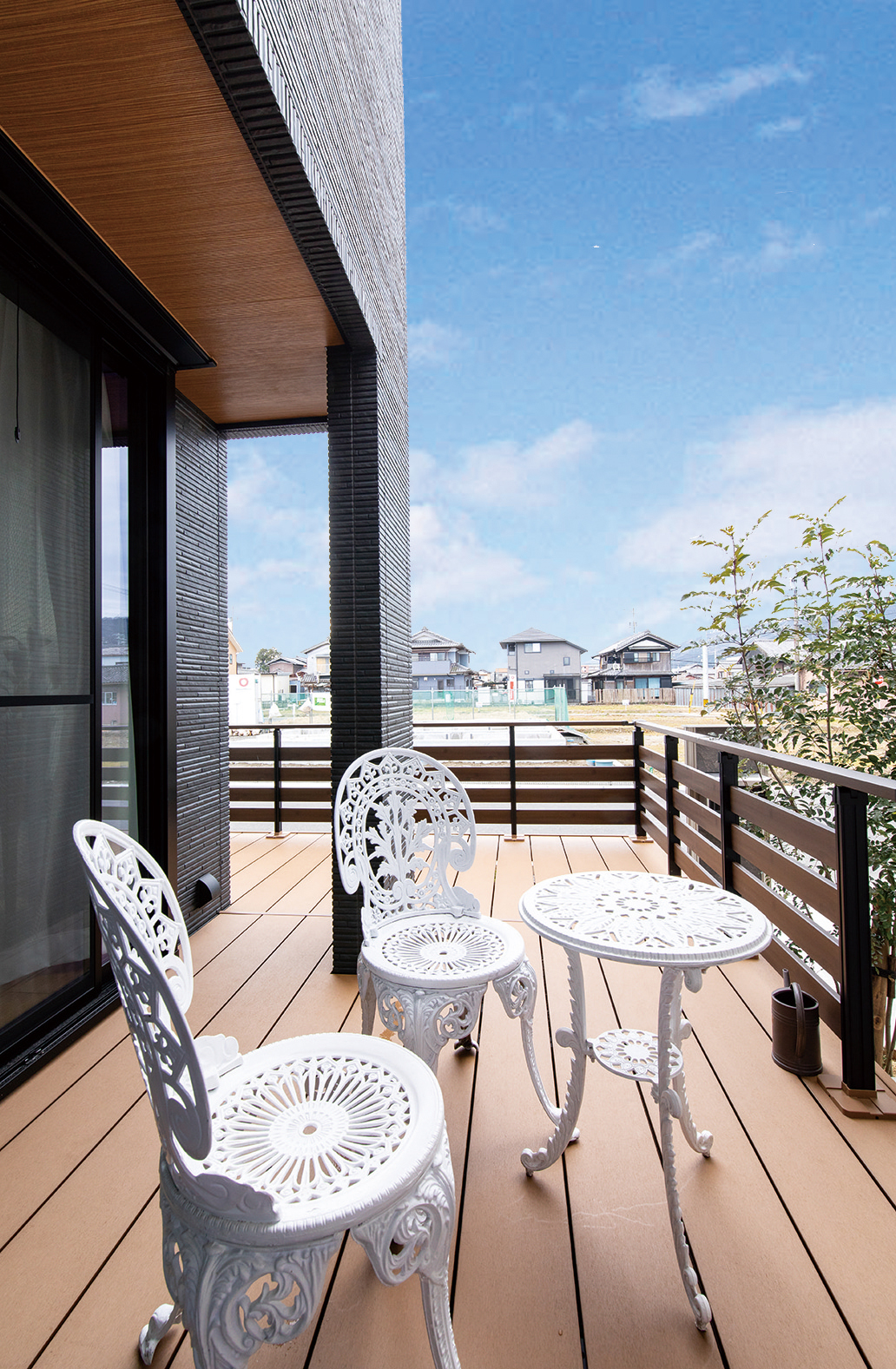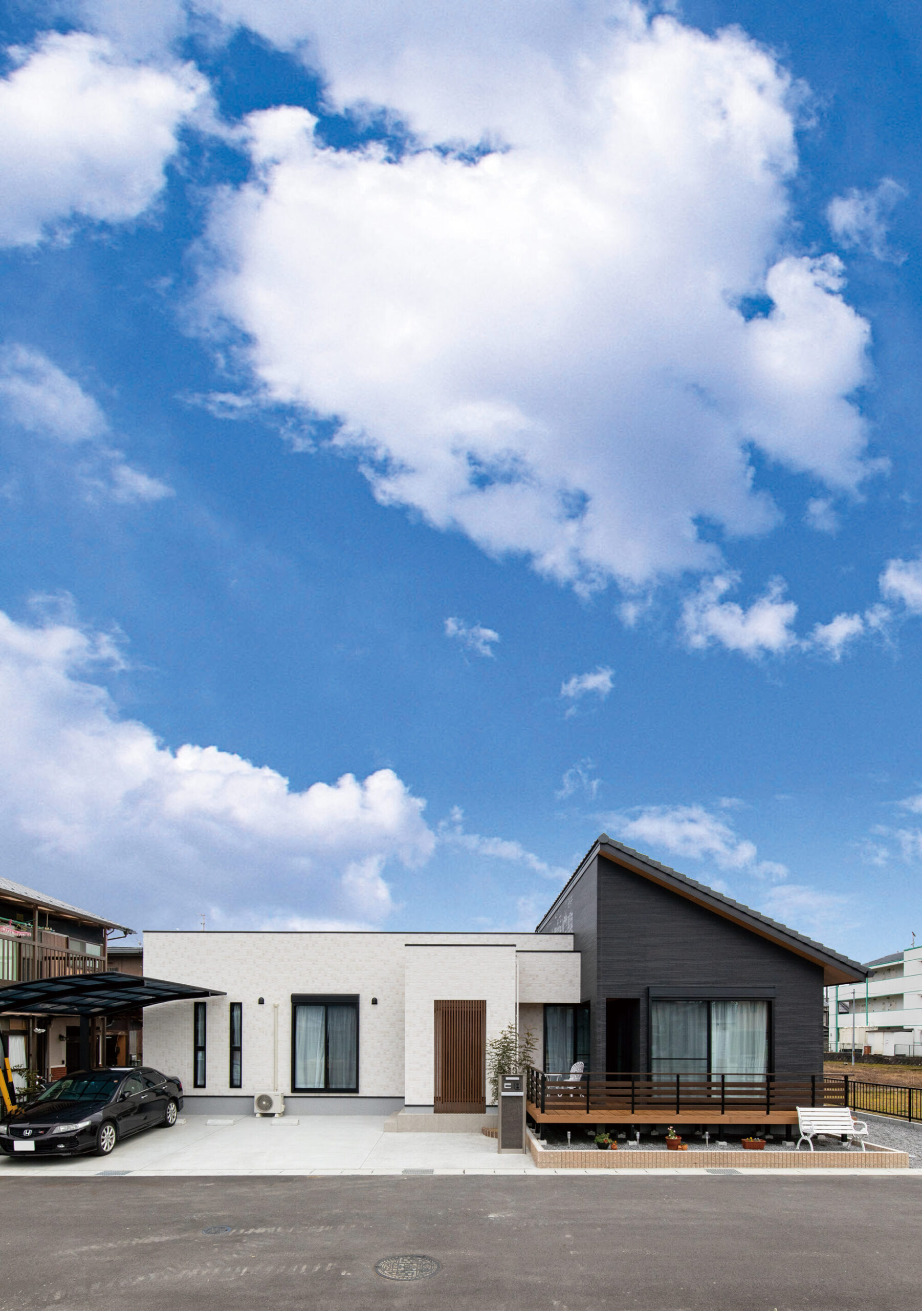 片流れ屋根を取り入れた個性的な平屋です。中央の玄関を境に、向かって左側が個室や寝室をまとめたプライベートエリア、右側がリビングなどのパブリックエリアです。平屋では家族間のプライバシーに配慮した間取りが難しいものですが、左右に振り分けることでクリアできました。リビングからボーダーレスに広がるウッドデッキは開放感いっぱい! フェンスで囲ったことで、室内にいるような安心感と、屋外の爽快感を味わえます。さらに奥まった部分にテラステーブルを設置。気分転換したいときは、ここでカフェタイムをどうぞ。