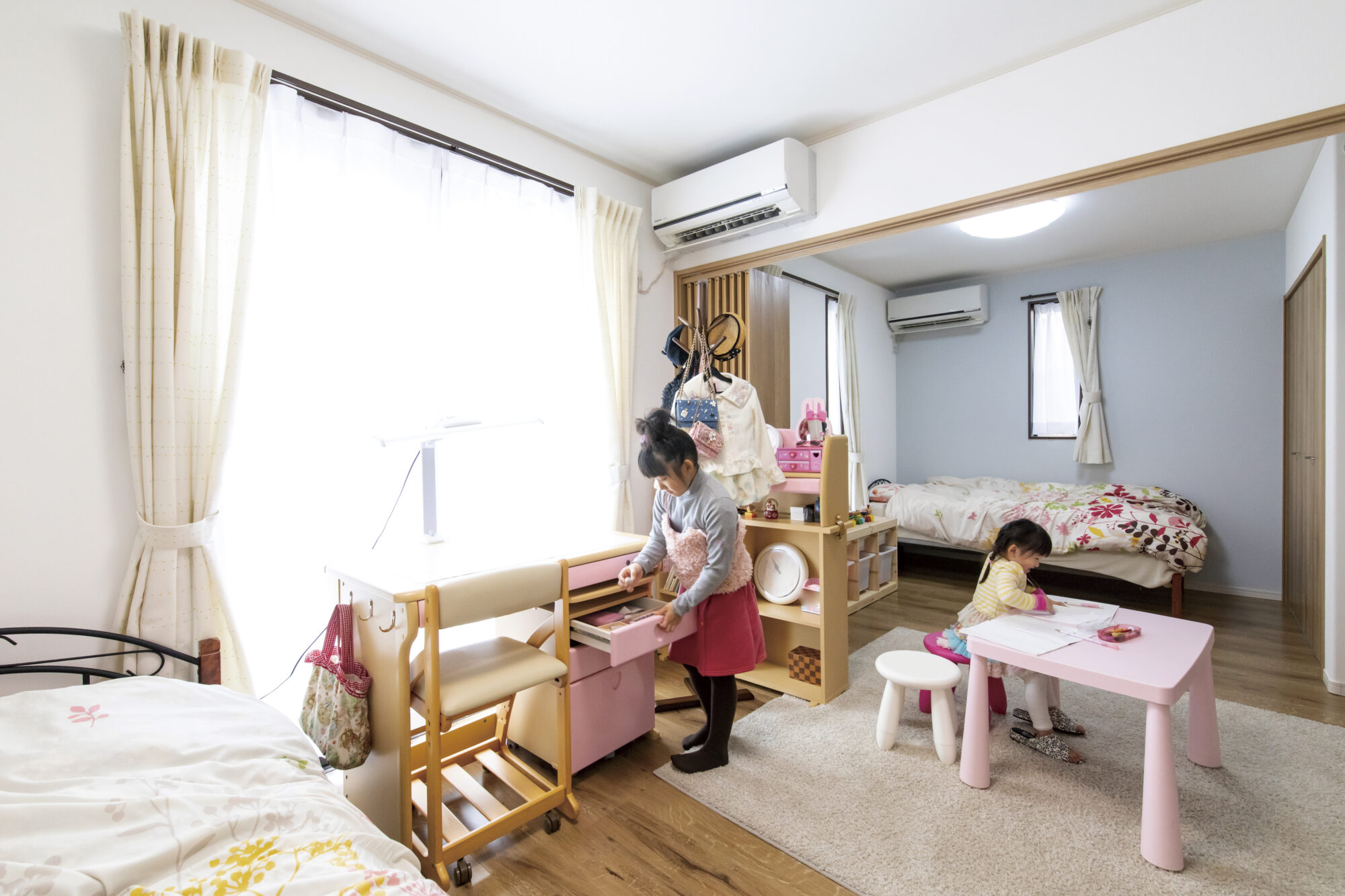 畳の間は、普段から気軽に使えるように、和室タイプではなく、“畳コーナー”にしました。仕切り扉は戸袋スペース不要の折れ戸タイプ(右端に一部写っています)。このコーナーの形に合わせて造作したオリジナル品で、他の場所の建具と面材を揃えているのでリビングに違和感なくなじみます。部屋の広さは3畳半と小ぶりながら、クローゼットや板の間も備えた使い勝手のいいつくり。おひな様を飾るのにもちょうどいい場所ですね。