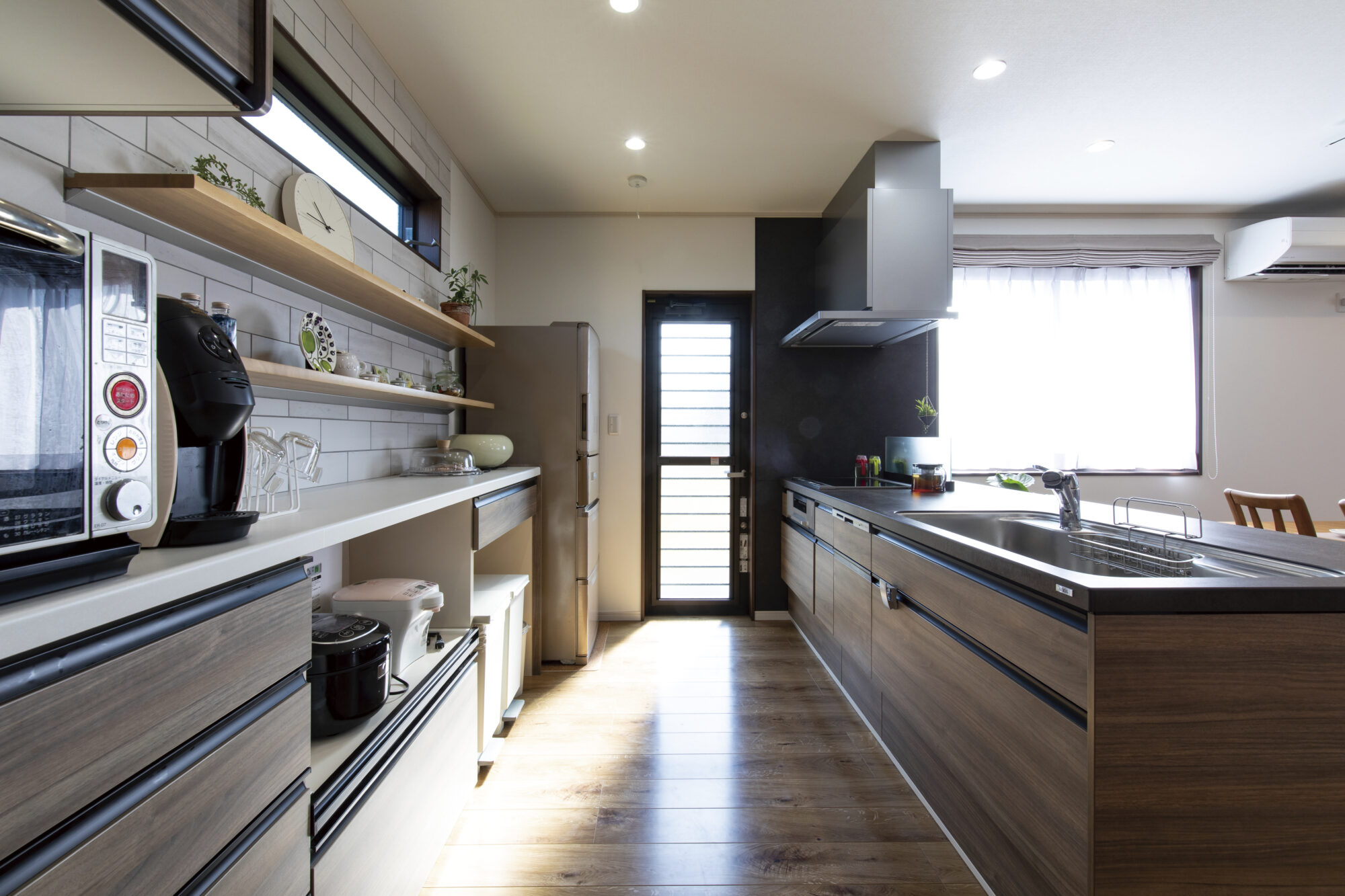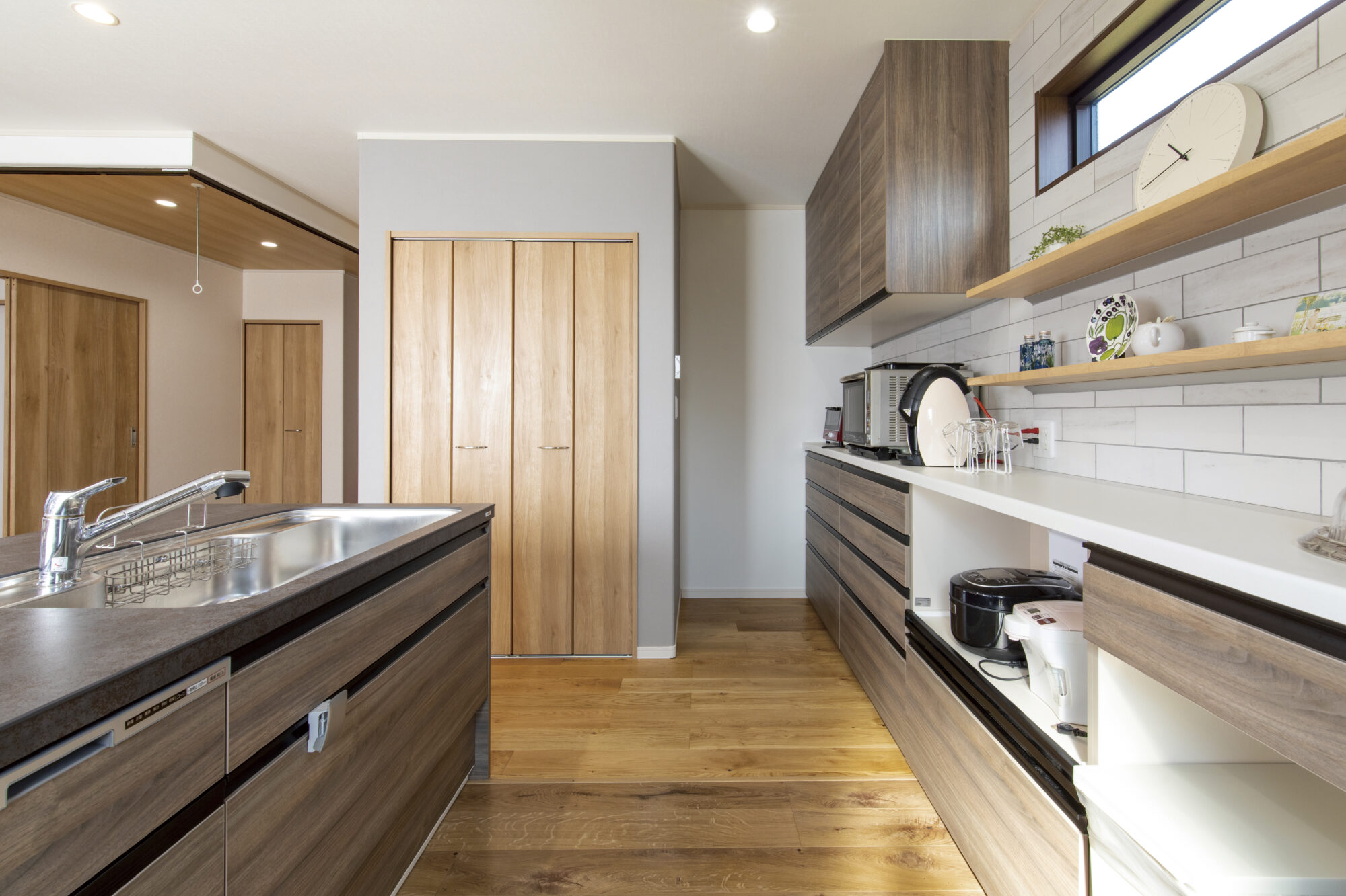 勝手口、背面の採光窓、ダイニング横の大きな窓から光がたっぷりと入り、キャビネットや床の木目がきれいに照らされています。キッチンのワークトップはセラミック製。キズや熱に強く、何よりスタイリッシュ! 焼き物のような高級感があり、キッチンエリアのグレードを一気に引き上げくれます。リビングやダイニングからもよく見えるカップボードの上には飾り棚をつけました。大柄タイルのクロスをバックに、おしゃれな食器やキッチンツール、雑貨で彩ればお部屋全体が華やぎますね。