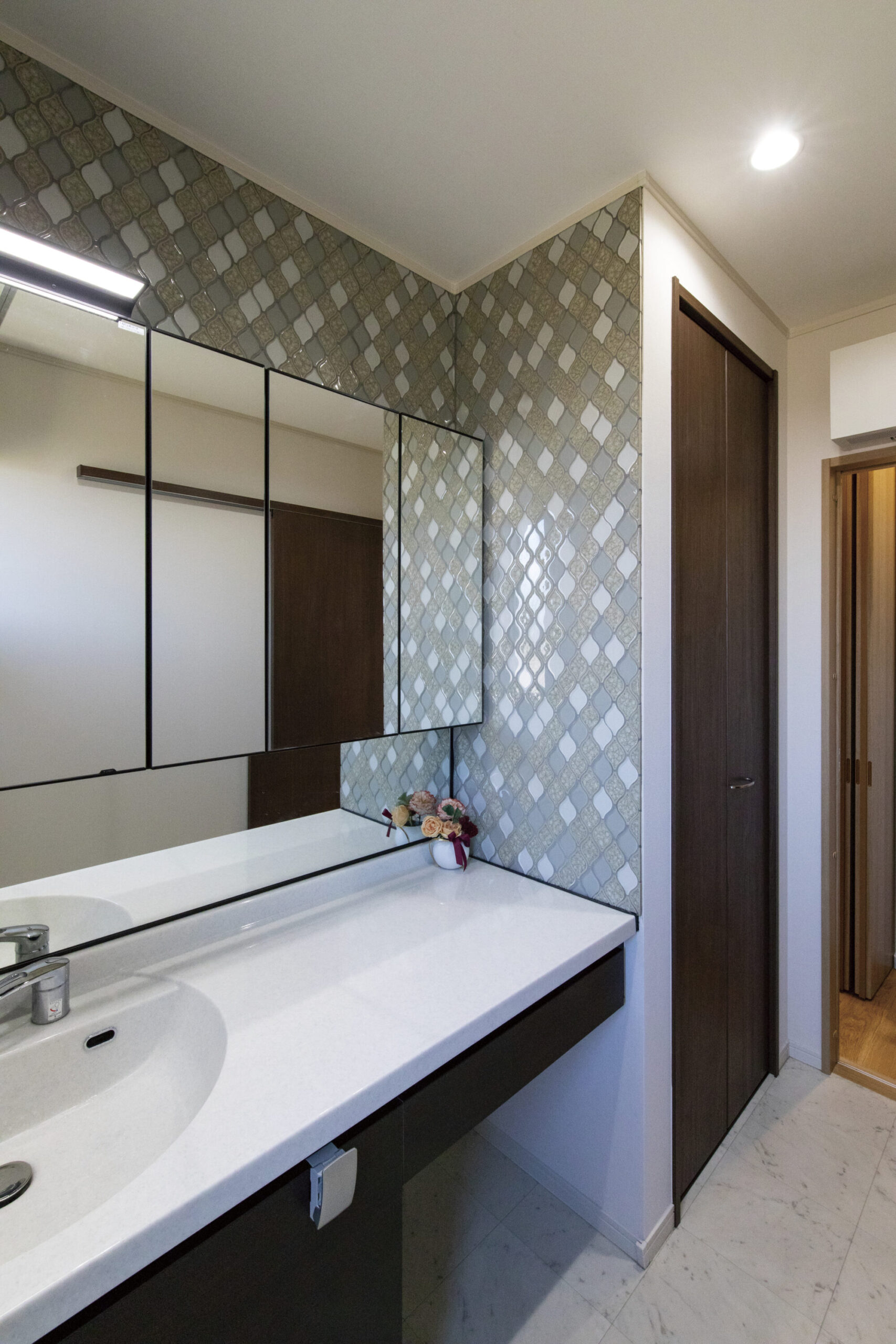 ランタン型のモザイクタイルがステキです。木目と同じように、ランダムなパターンに癒やされます。洗面台は何人かで使えるようにワイドタイプにしました。チャイルドミラー付きなので、お子様も自分で身だしなみをチェックできます。また、チャイルドミラーは、空間が広がって見えるというメリットもあるんですよ。洗面ボウルはカウンターとシームレスに繋がる一体型。サッと一拭きできるので、ピカピカ状態とお手入れの意欲をキープできます。