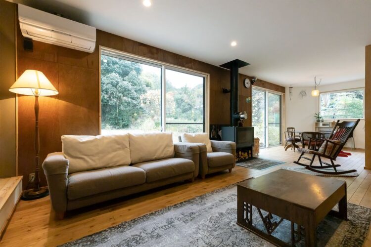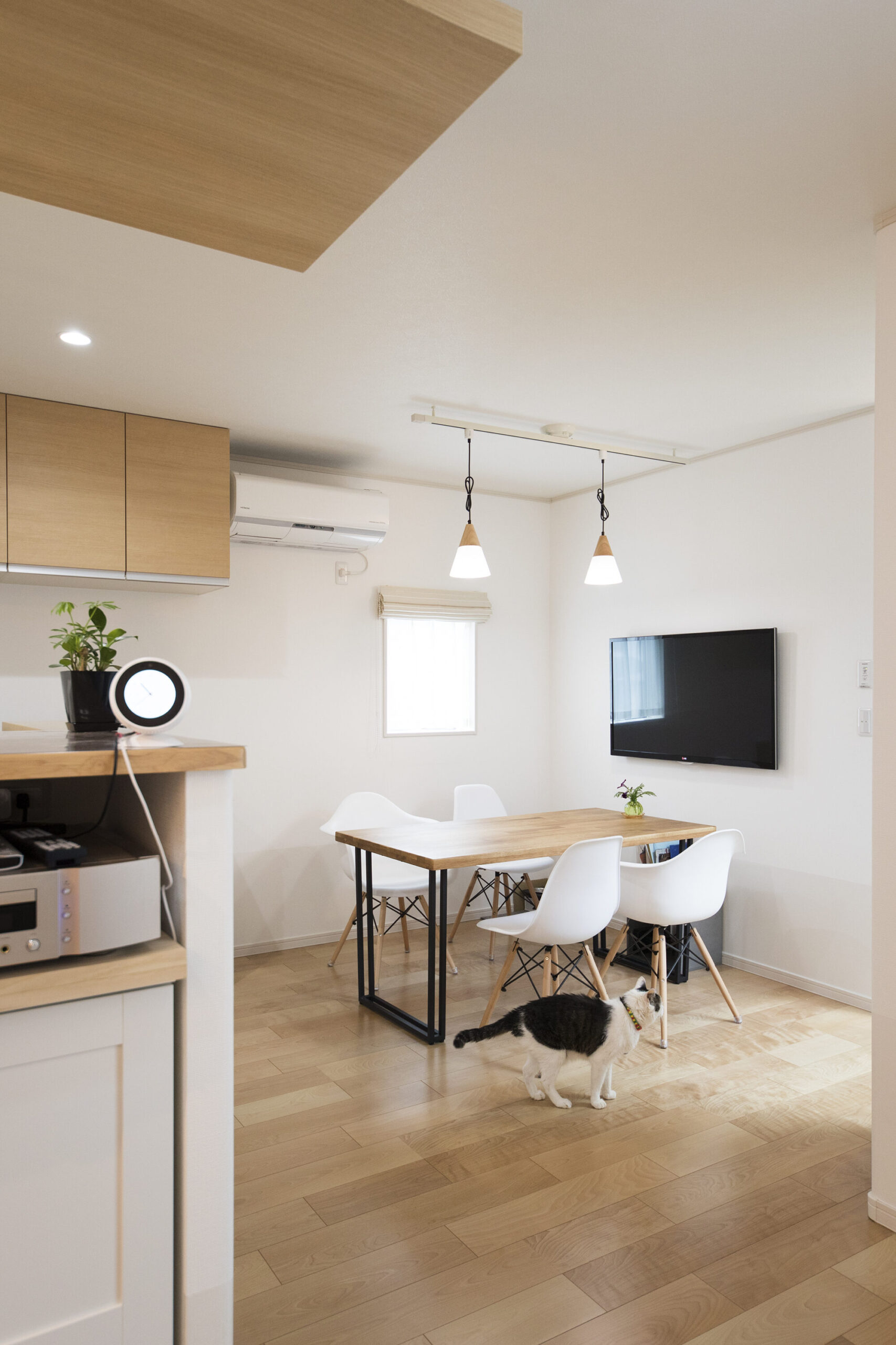 内装にぴったりな木製ダイニングセットです。木目のペンダントライトもかわいらしいですね。ダイニングのレイアウトはキッチンと横並びにしました。キッチンから横に移動するだけなので、食事の準備や片付けがはかどります。またキッチンとダイニングの一体感が強まったことで、鑑賞空間であるリビングとめりはりがつけることができました。エアコンはダイニング側に設置。リビングと離れたこの場所ならば、鑑賞中も送風音が気になりません。