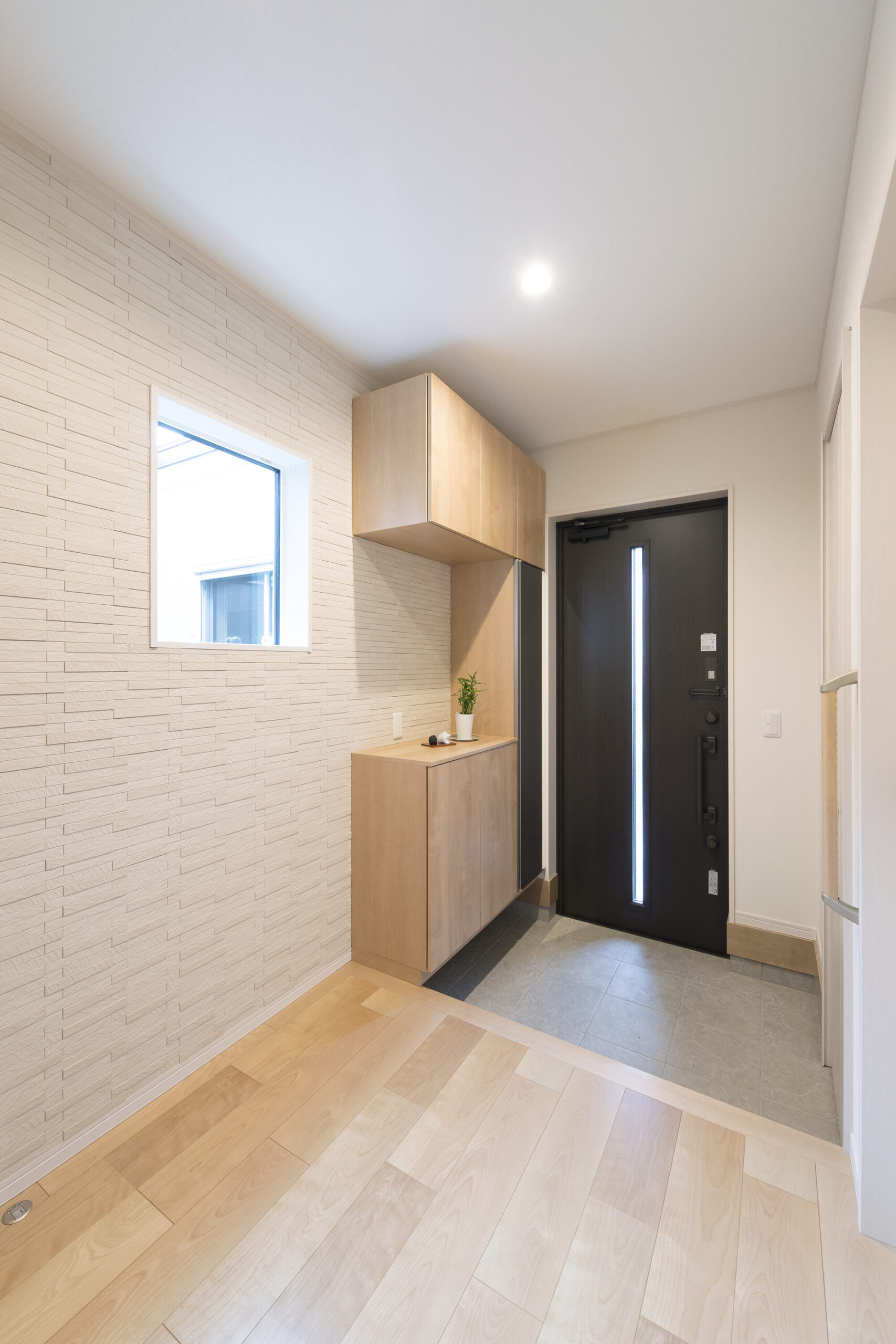 中庭に面した小窓から爽やかな光が入ります。帰宅したときに、中庭越しにダイニングやリビングがちらっと見えるのが嬉しいですね。反対側の扉の奥は土間収納で、シューズボックスと合わせてかなりの収納力があります。さらに、こちらの玄関ホールはLDK、寝室兼個室、トイレの出入り口が集中しています。さまざまな空気が入ってくる場所であるため調湿、脱臭作用のあるエコカラットを壁一面に施工しました。ストーン調のエコカラットはインテリアとしても見応えがありますね。