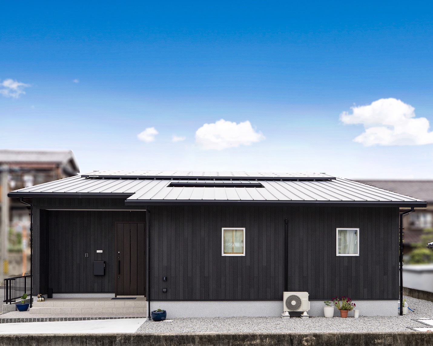 上から見るとほぼ正方形、大きくなだらかな片流れ屋根が覆う美しい外観です。端正なフォルムは構造的に丈夫なので、日々の暮らしにもどことなく安心感を覚えるのではないでしょうか。スタイリッシュでモダンな外観ですが、外壁はしっとりとした黒の板壁風です。玄関まわりもアクセントカラーなどは入れず、あえて黒に徹底したことで奥ゆかしさと高級感が出ました。砂利の手前には石庭を設けており、黒い板壁と合わせて和の風情を感じさせます。