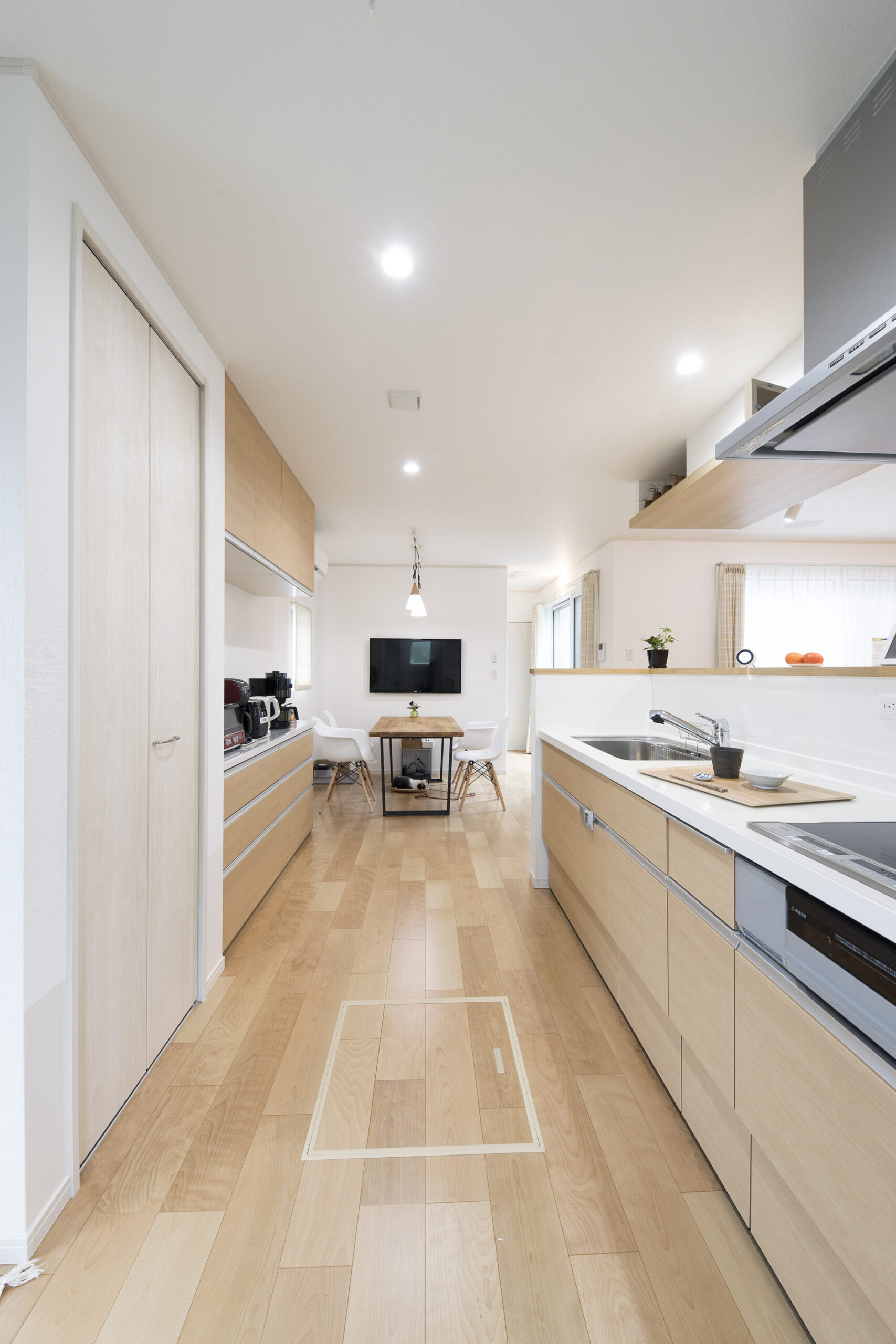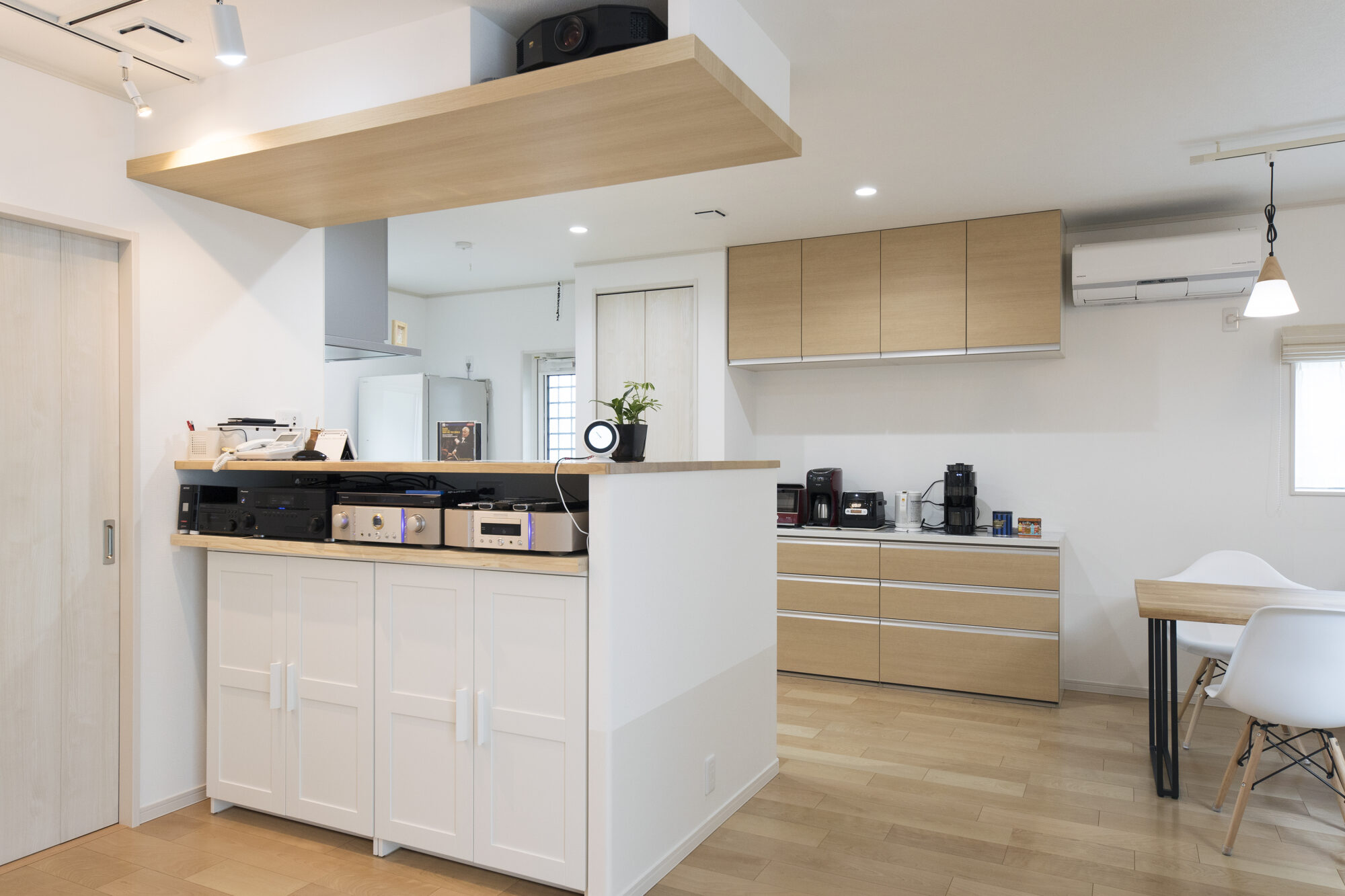 木目が爽やかですね。LDKは、中庭に面した2箇所の掃き出し窓から自然の光が入ってきます。とくにキッチンは、採光の小窓も設けているため、より明るく気持ちのいい空間となりました。カウンターはハイバックタイプで、裏側がAV機器類の収納スペースとなっています。かなり高さがあるのでお料理の手元をしっかりと隠すことができ、ホームシアターの非日常感を損ねることもありません。頭上のプロジェクター収納は、奥行きを生かして半分はキッチン収納として活用しています。