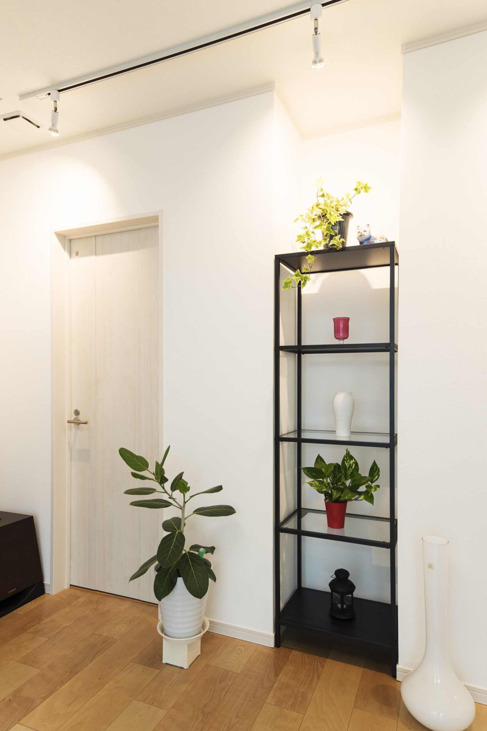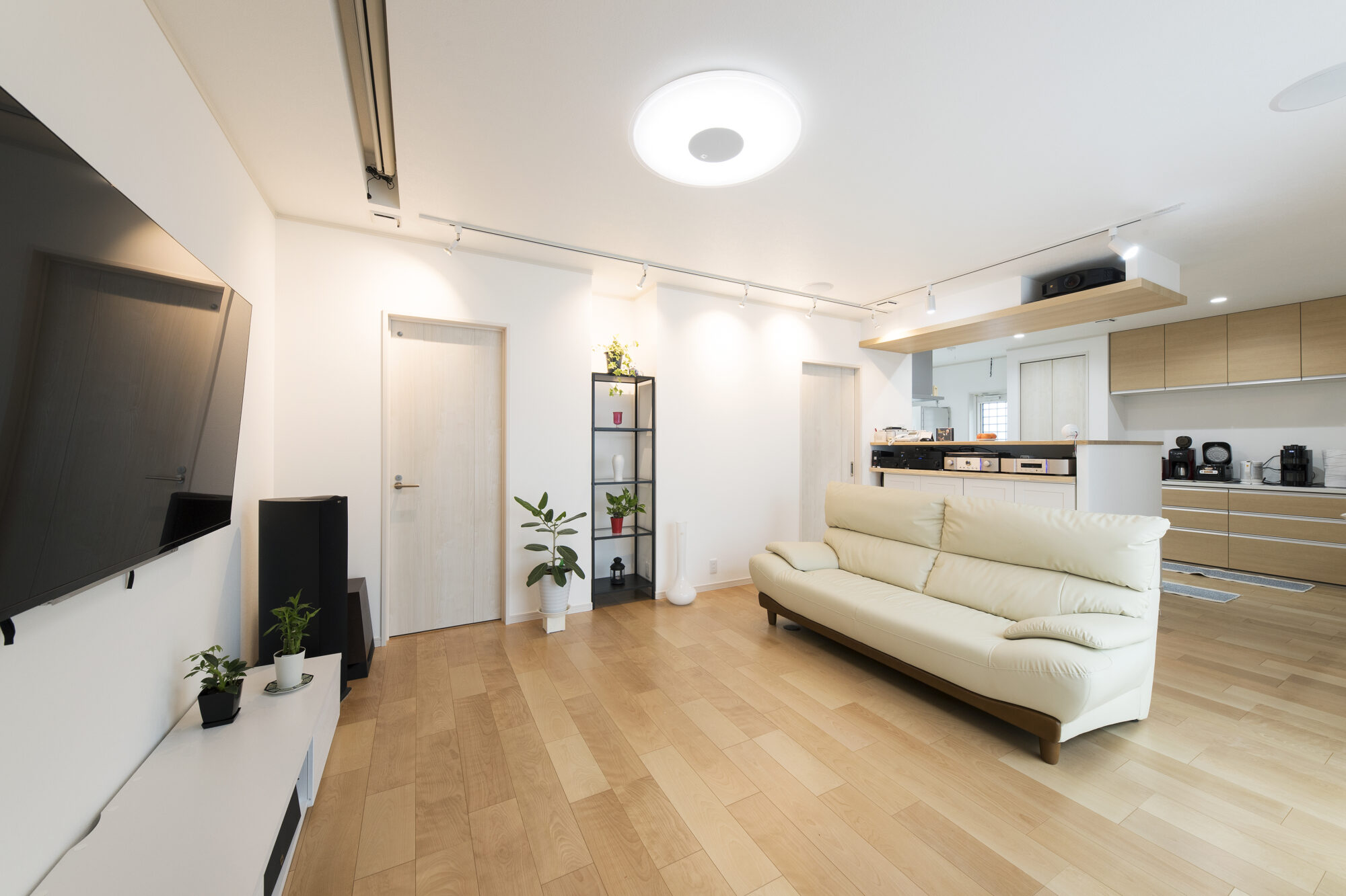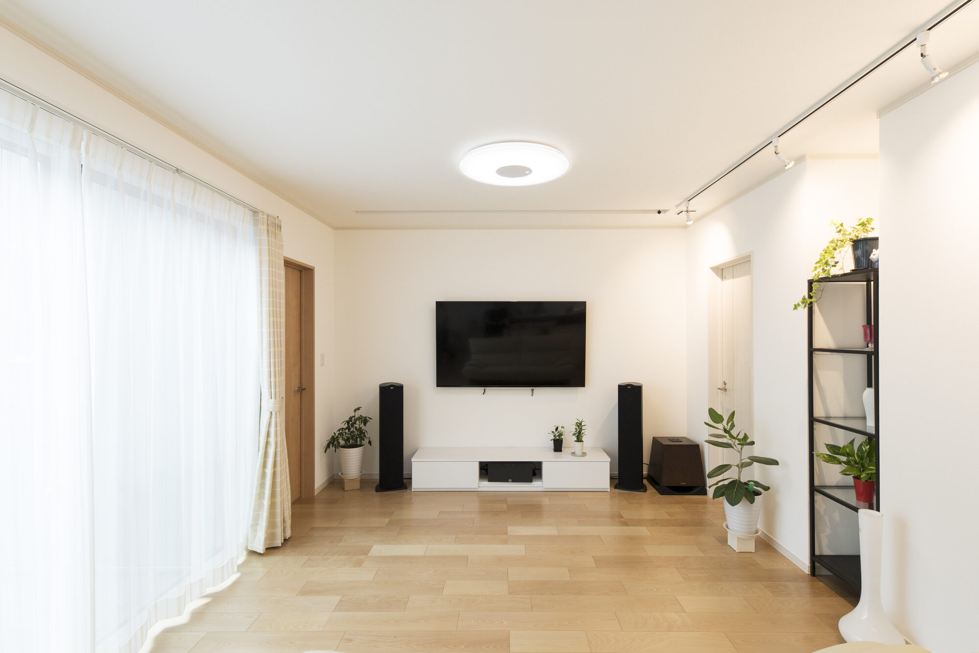シックな外観から一転して、室内は爽やかなホワイトコーディネートです。こちらのリビングはホームシアター仕様になっており、テレビ前の天井にスクリーンを、ソファの後ろの収納家具にプロジェクター類を格納しています。これらの家具は機器のサイズに合わせて造作したもので、扉にモールドを施すなど装飾にも懲りました。サイドのスポットライトを壁に向けているのは間接照明として利用するため。鑑賞中はシーリングライトを消して、雰囲気のある灯りの中で楽しみます。