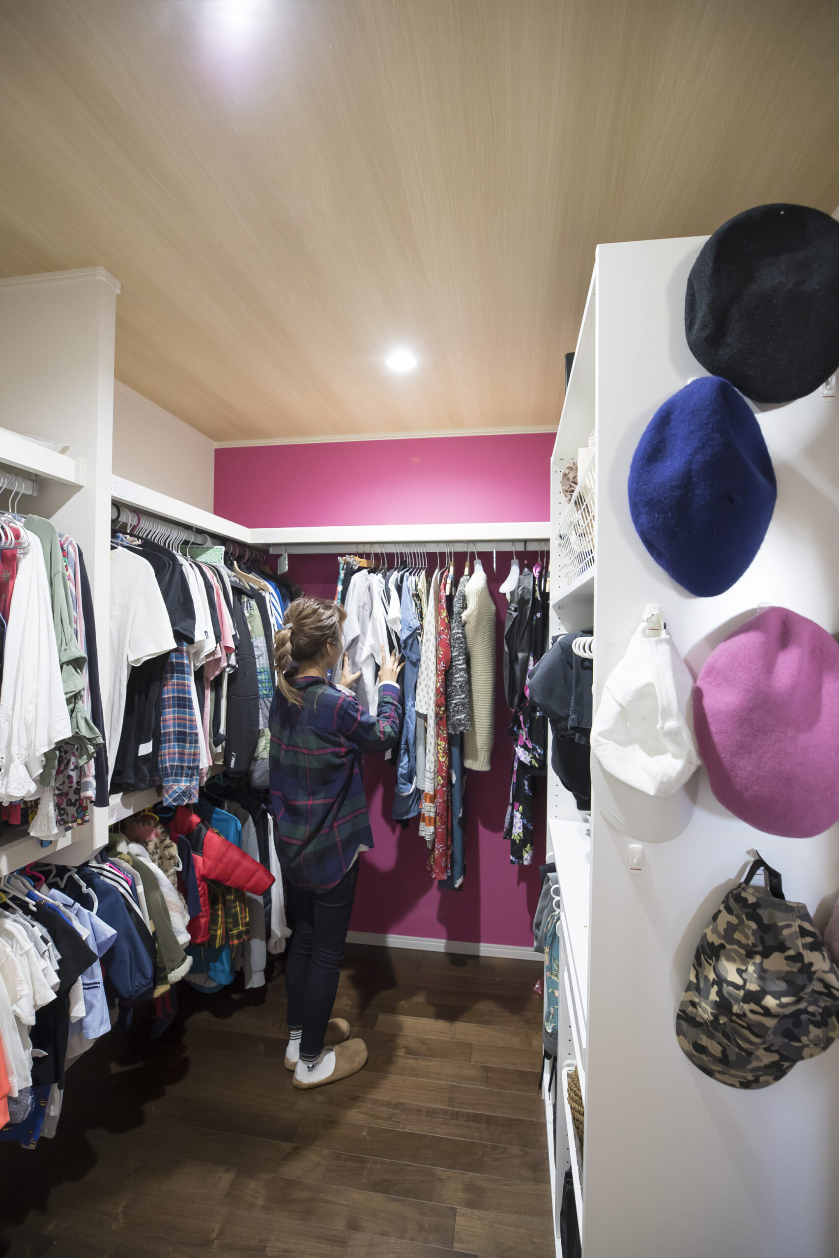 寝室の一角に設けたウォークインクローゼットです。7畳半の寝室のほぼ半分を占めるほどの広々サイズ。L字にハンガーパイプを巡らせ、衣類の丈ごとに効率よく収納できるようにしました。また、帽子なども工夫しておしゃれに収納。ショップのように何がどこにあるか一目瞭然なので、お出かけ前のコーディネートがしやすいですね。アクセントカラーとして、他の場所では使っていない華やかなピンクをチョイス。お家の中で一番カラフルな空間になりました。