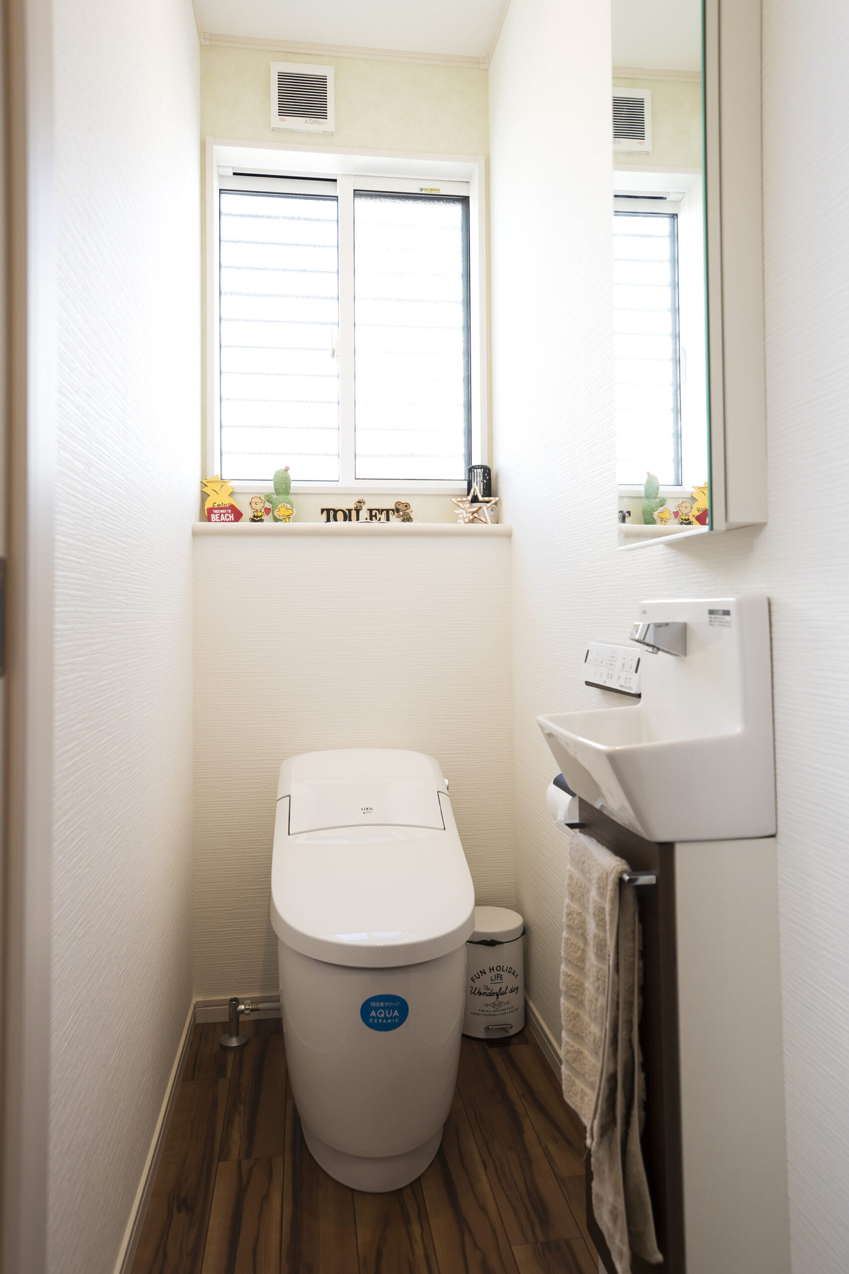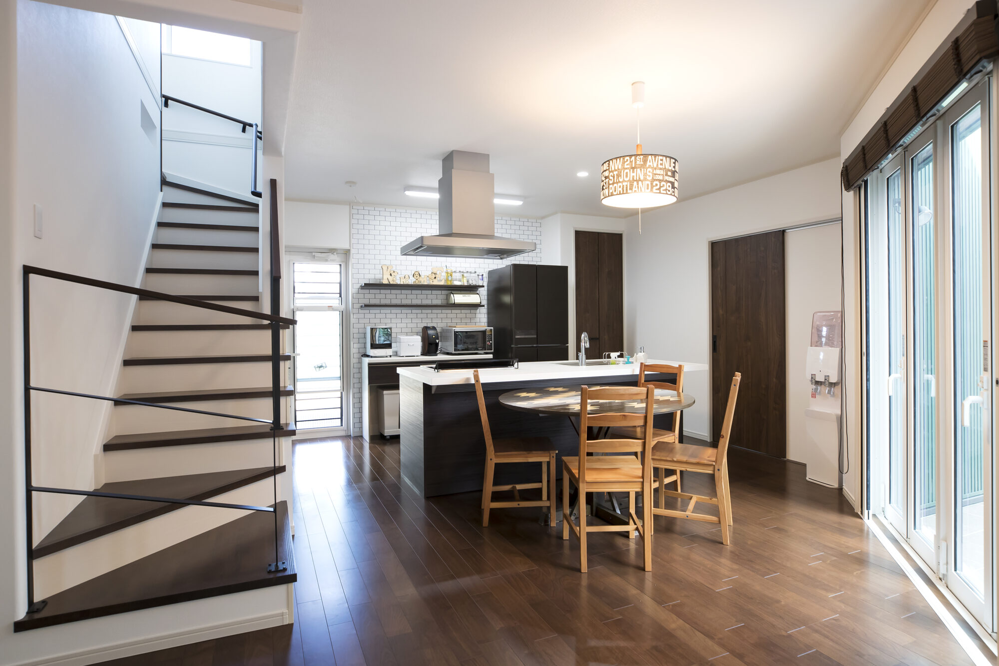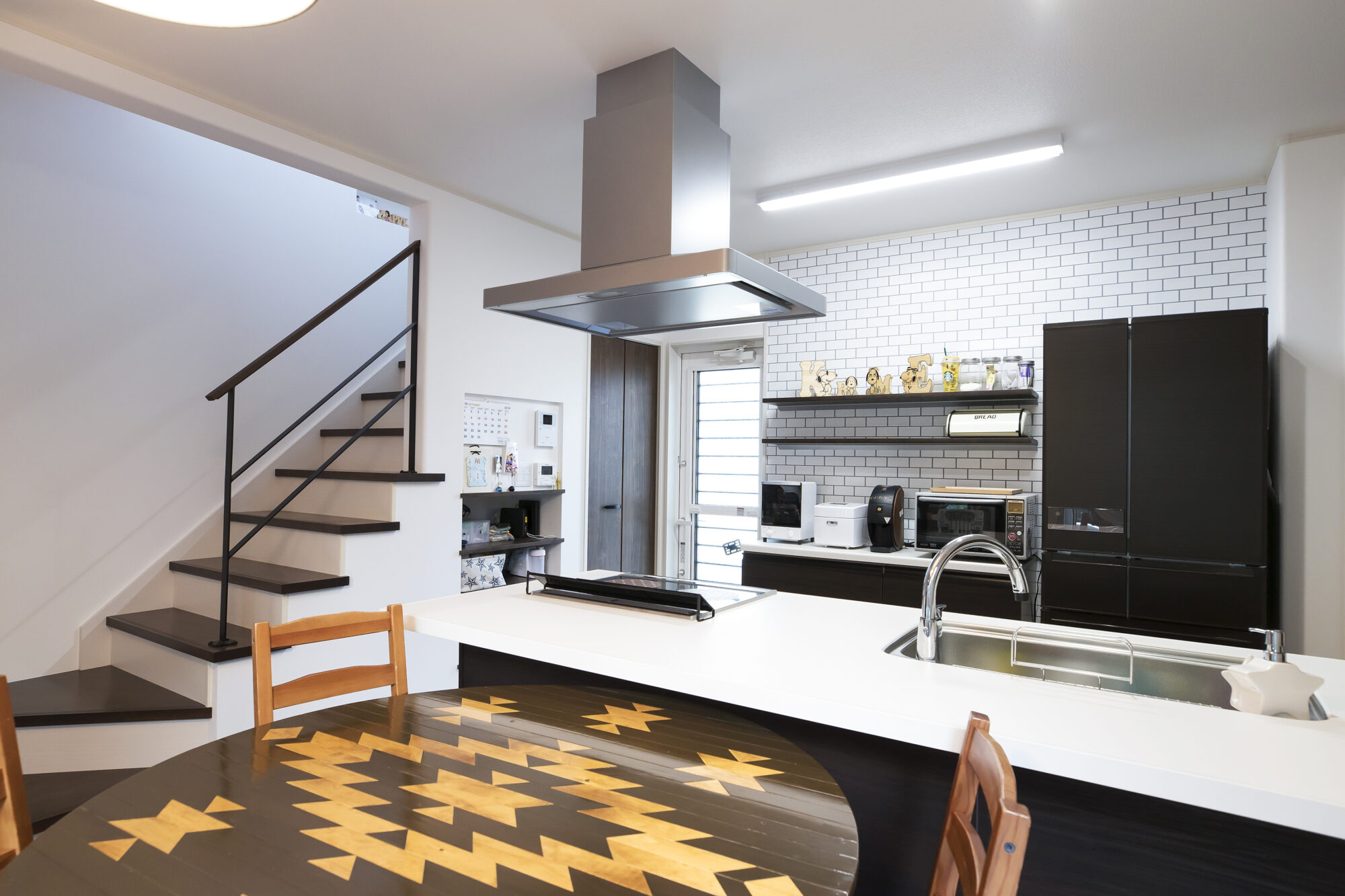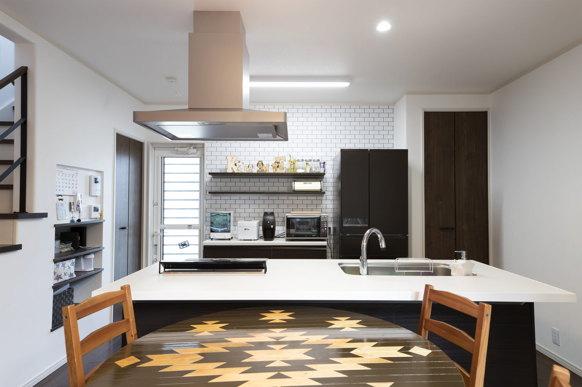 見晴らしのいいオープンスタイル、かつ人の行き来にストレスのないアイランドキッチンです。ダイニングとの一体感がすばらしく、自然と人を引き寄せる魅力があります。収納は大きなパントリーの他に、階段下収納やニッチ収納など小型の収納を随所に設けてボリュームを確保。一方、視線の集まるキッチンの後ろは吊り戸棚など設けず、おしゃれなタイル柄をバックに雑貨の映える飾り棚をつくりました。テーブルの手前は大きな掃き出し窓。勝手口を開けると、堀からの風が気持ちよく吹き抜けます。