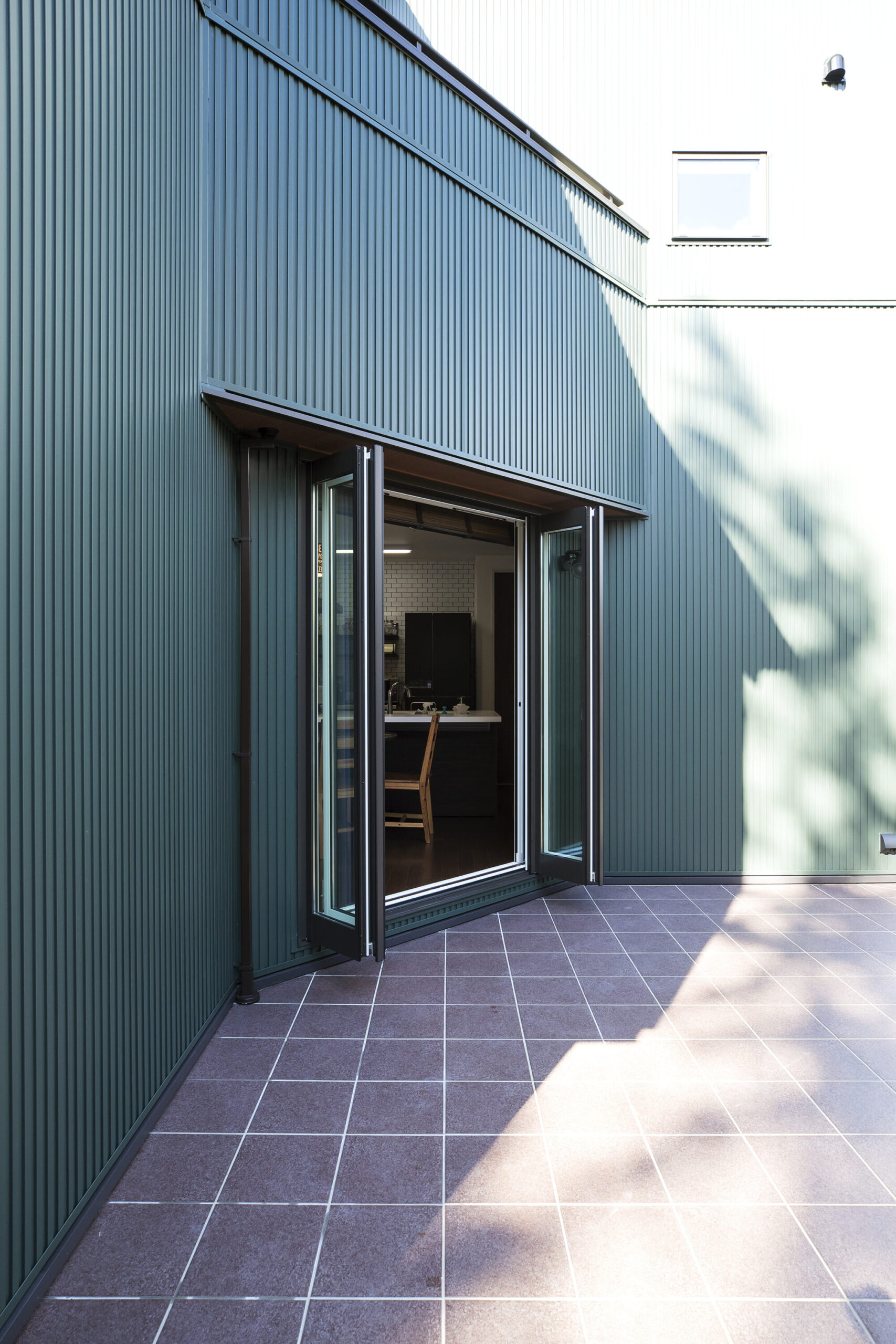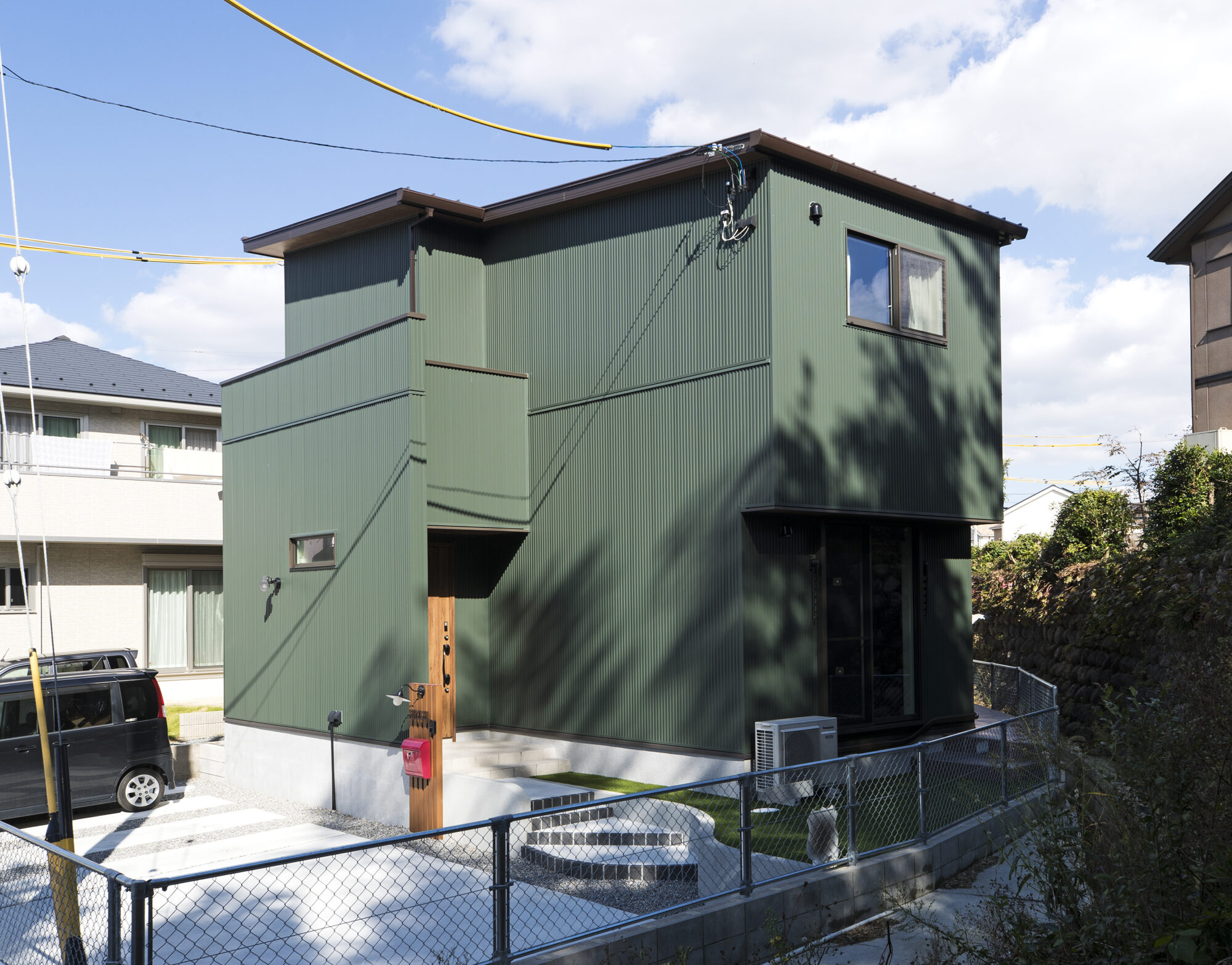 ガルバリウム鋼板のおしゃれな外観。スタイリッシュでありながら、自然と調和するモスグリーンを使っているのでやさしさも感じられます。建物は三角形の変則的な敷地に建ち、裏の堀に向かって扇字型に開いた形になっています。人目のある道路側は窓を少なくいたってシンプルに、静かな堀側にLDKを配置して、オープンにくつろげる家にしました。やや面積が狭いことは工夫でカバー。2階を部分的に張り出させて、居室に十分な広さを確保しています。見た目にも日常を離れた浮遊感が生まれ、デザイン性の高い外観になりました。