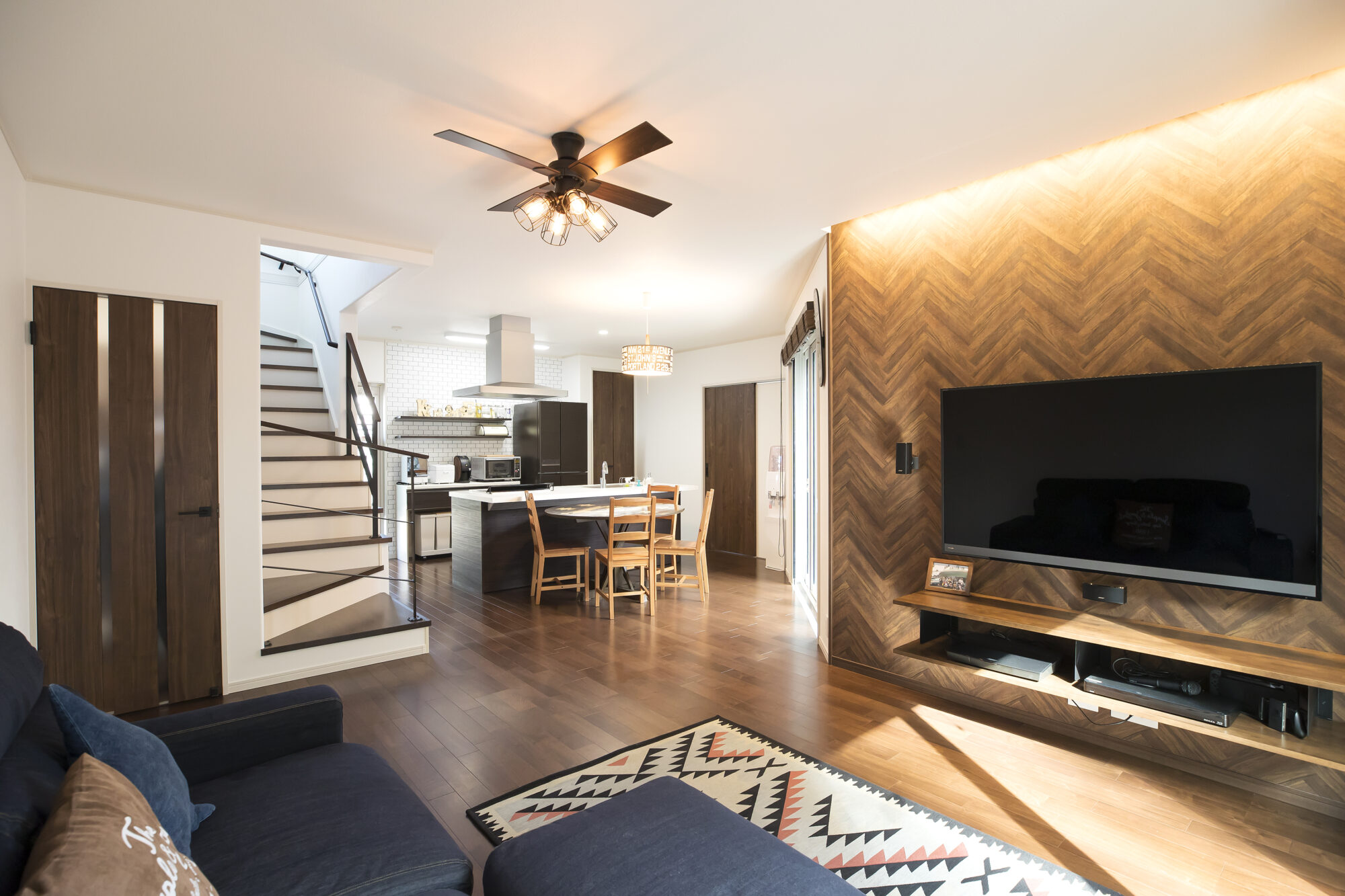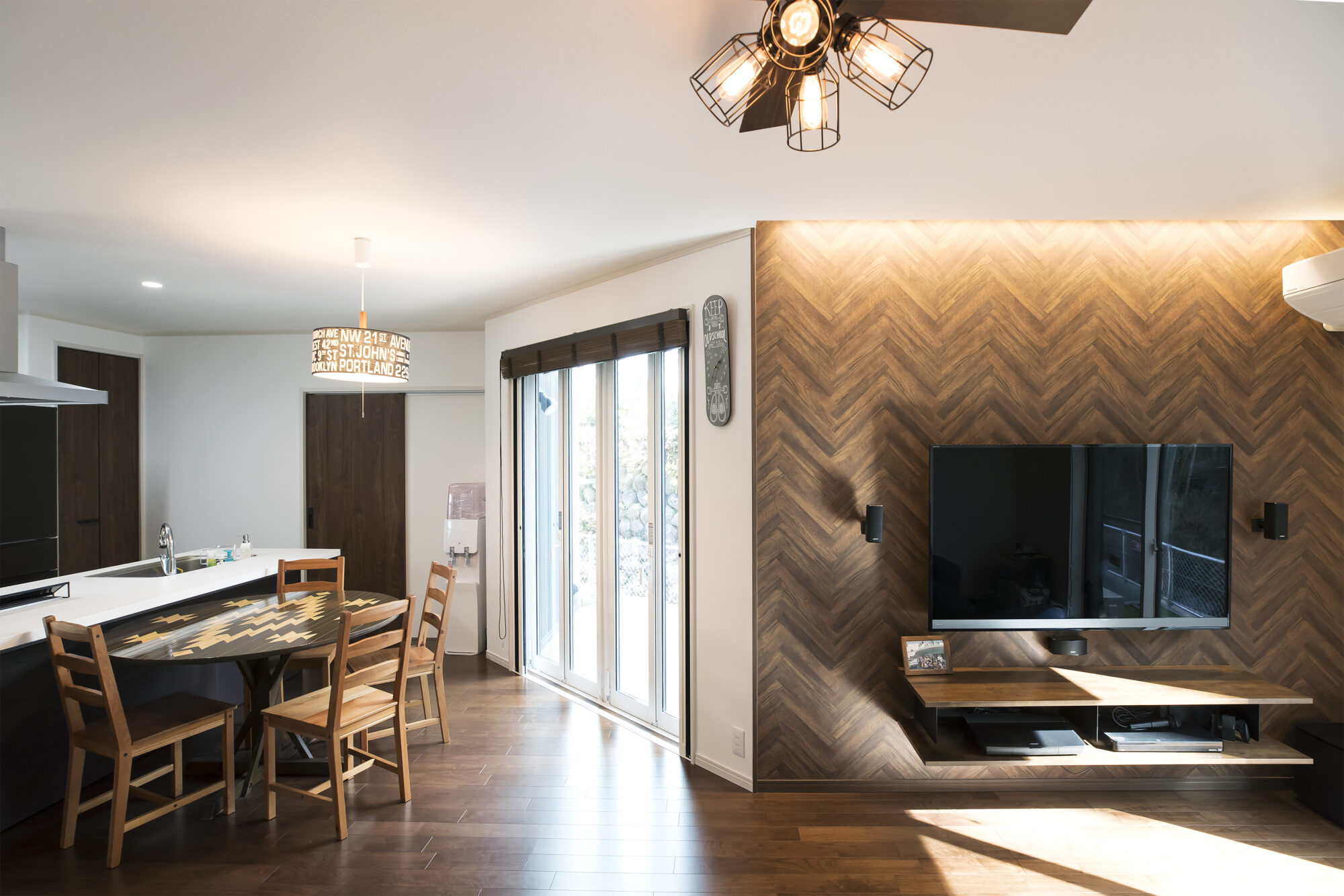 鈍角でゆるやかにくびれるLDK。食事とくつろぎの空間を分けつつ、一体感を保っているのがいいですね。大きな掃き出し窓はすべて堀に向かっているので、リラックスして過ごせるのもポイントです。内装は、ヘリンボーンのアクセントウォールをはじめ、木目の美しさを大胆に見せるナチュラルスタイル。さらに、家具やラグにネイティブ柄を取り入れてアメリカンな雰囲気を楽しんでいます。丸形のダイニングテーブルが、個性的なLDKにぴったり。ご家族のフレキシブルな生活を思わせます。