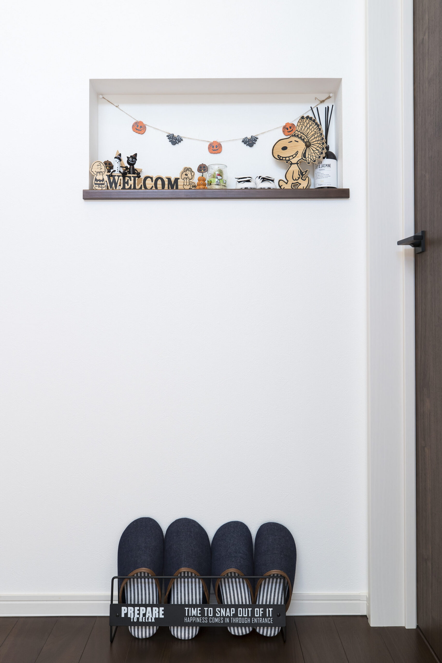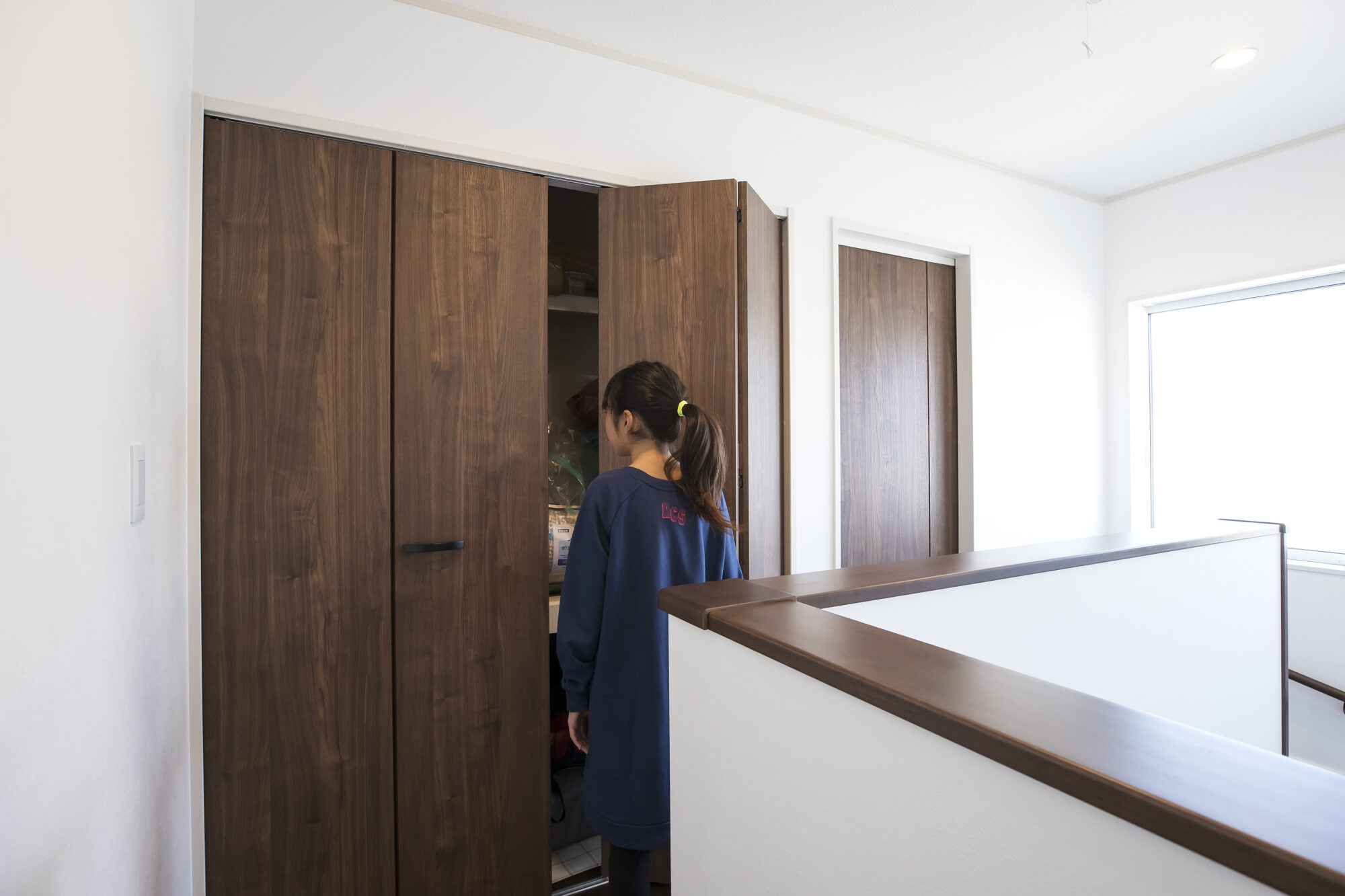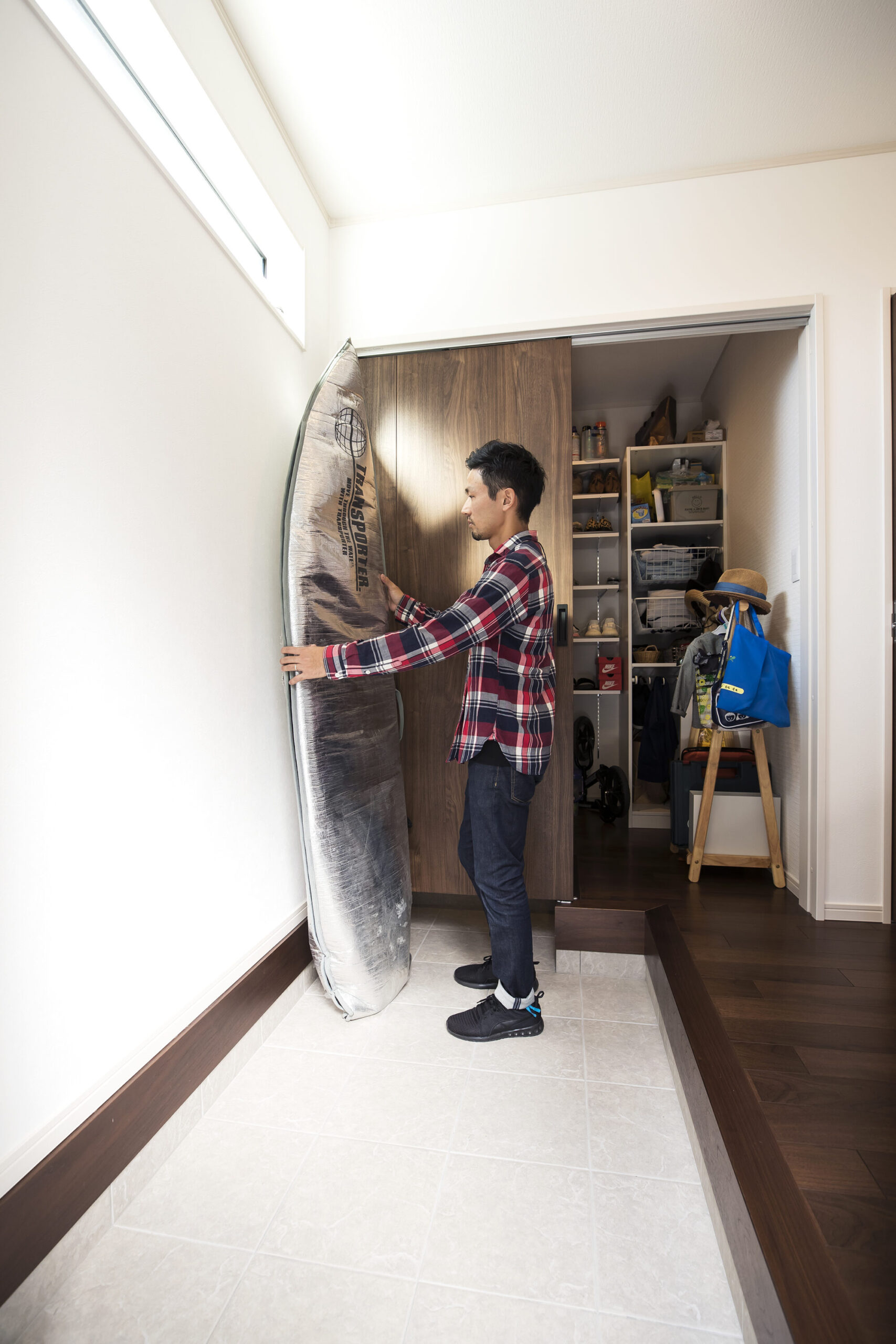 ご主人の趣味はサーフィン。靴やお出かけグッズの他に海の道具もしまえるように、広めの土間付き収納を設けました。引き戸で仕切られており、靴を脱ぎ履きすることなく、ホールからも土間からもアクセスできます。また、床の高さの分、引き戸の下が開いているので通気も十分。湿気やにおいがこもることがありません。採光窓は、外からの視線をはずすためにスリット窓を採用。高い位置からの光が、ホール全体をまんべんなく照らします。