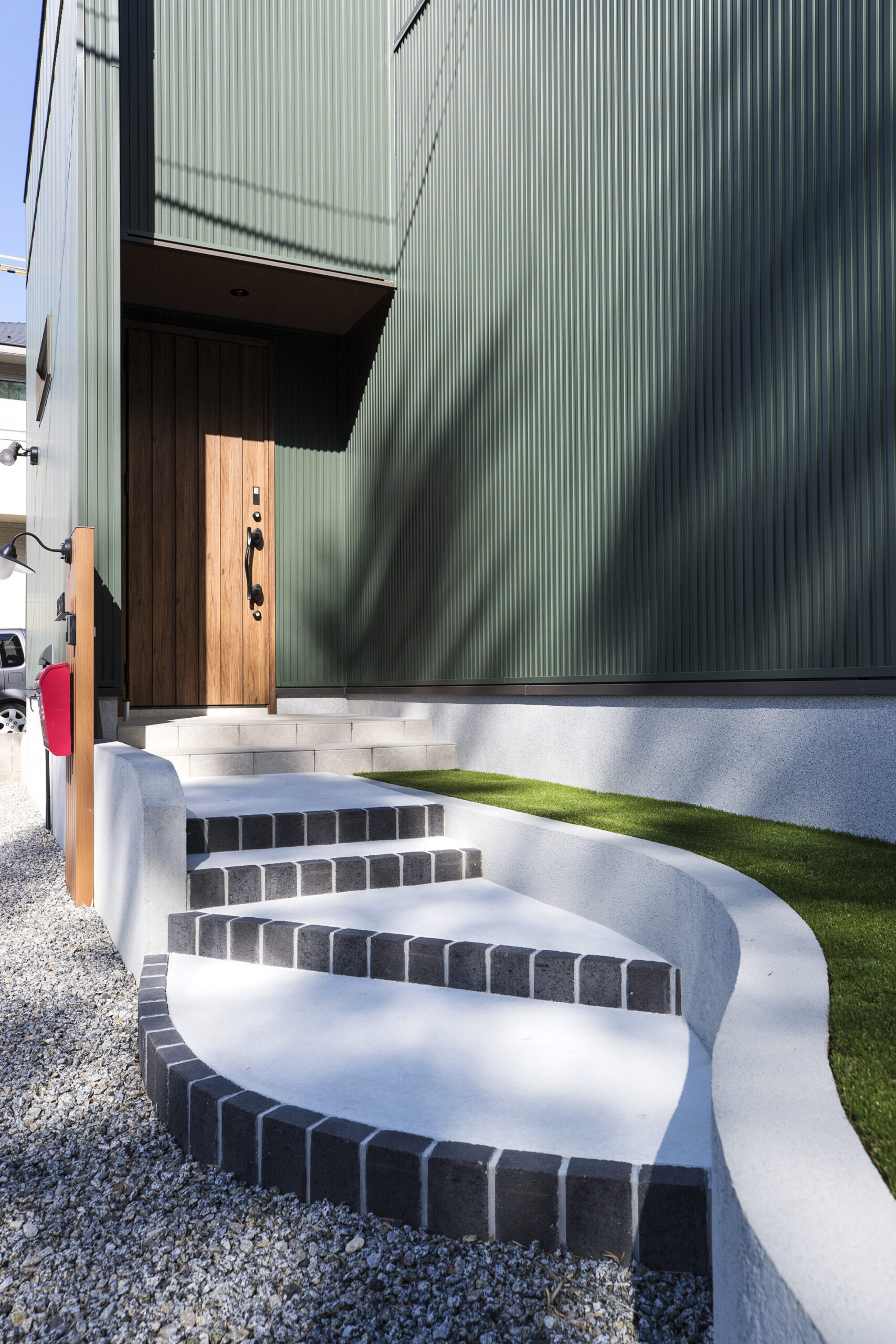 門柱とドアの温もりのある木目、アースカラーのモスグリーン、素朴なアイアンの組み合わせに癒しを感じます。そんな調和の取れた空間に、ビビッドな赤のメールボックスを置いて外観のアクセントにしました。曲がりくねったアプローチは、奥行き感を出す工夫。幾重にも寄せる波のような階段状のデザインがステキです。小さいながらかわいいアイデアを詰め込んだエントランス。出かけるたび、帰ってくるたびに嬉しい気持ちになりますね。