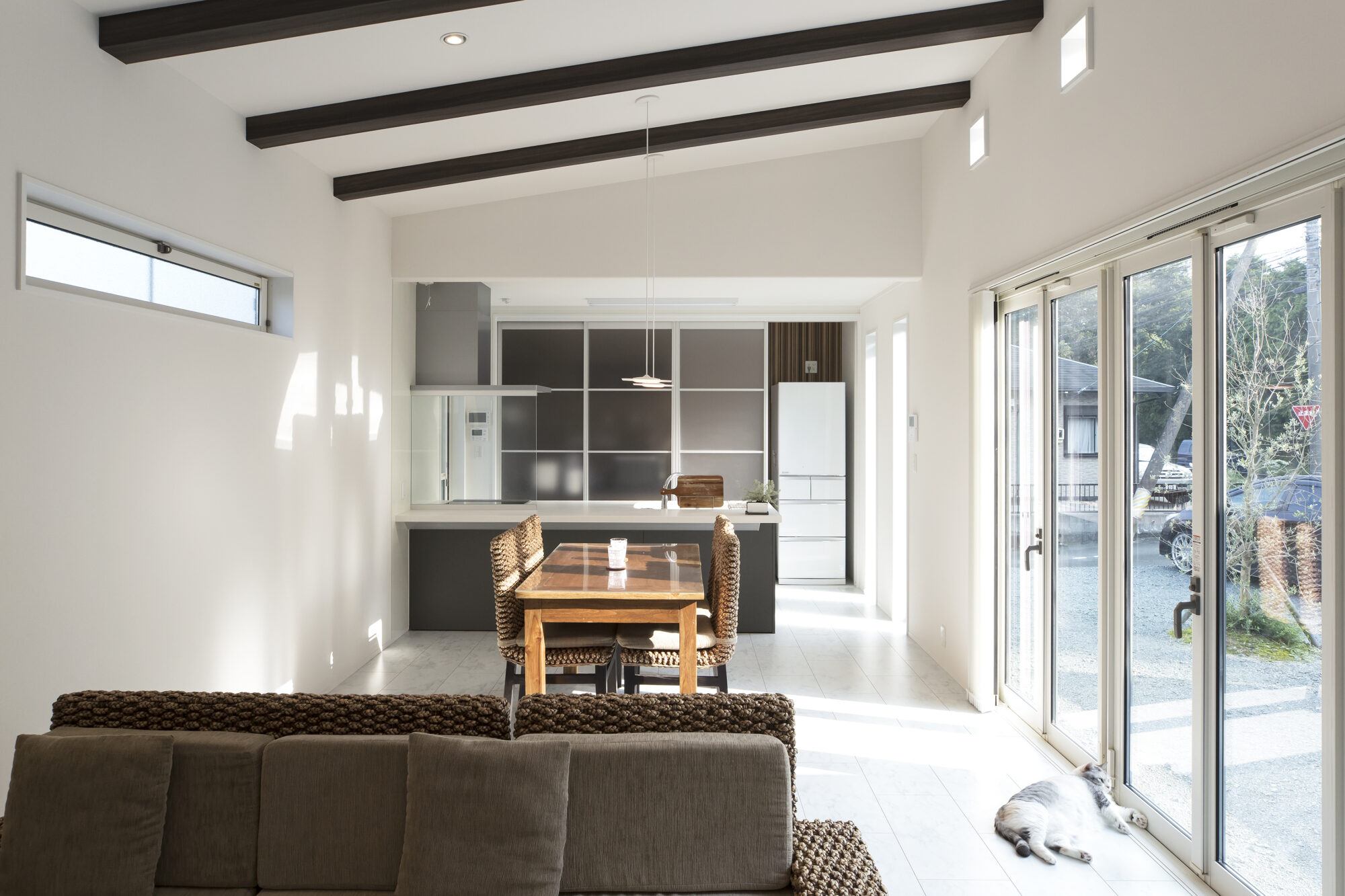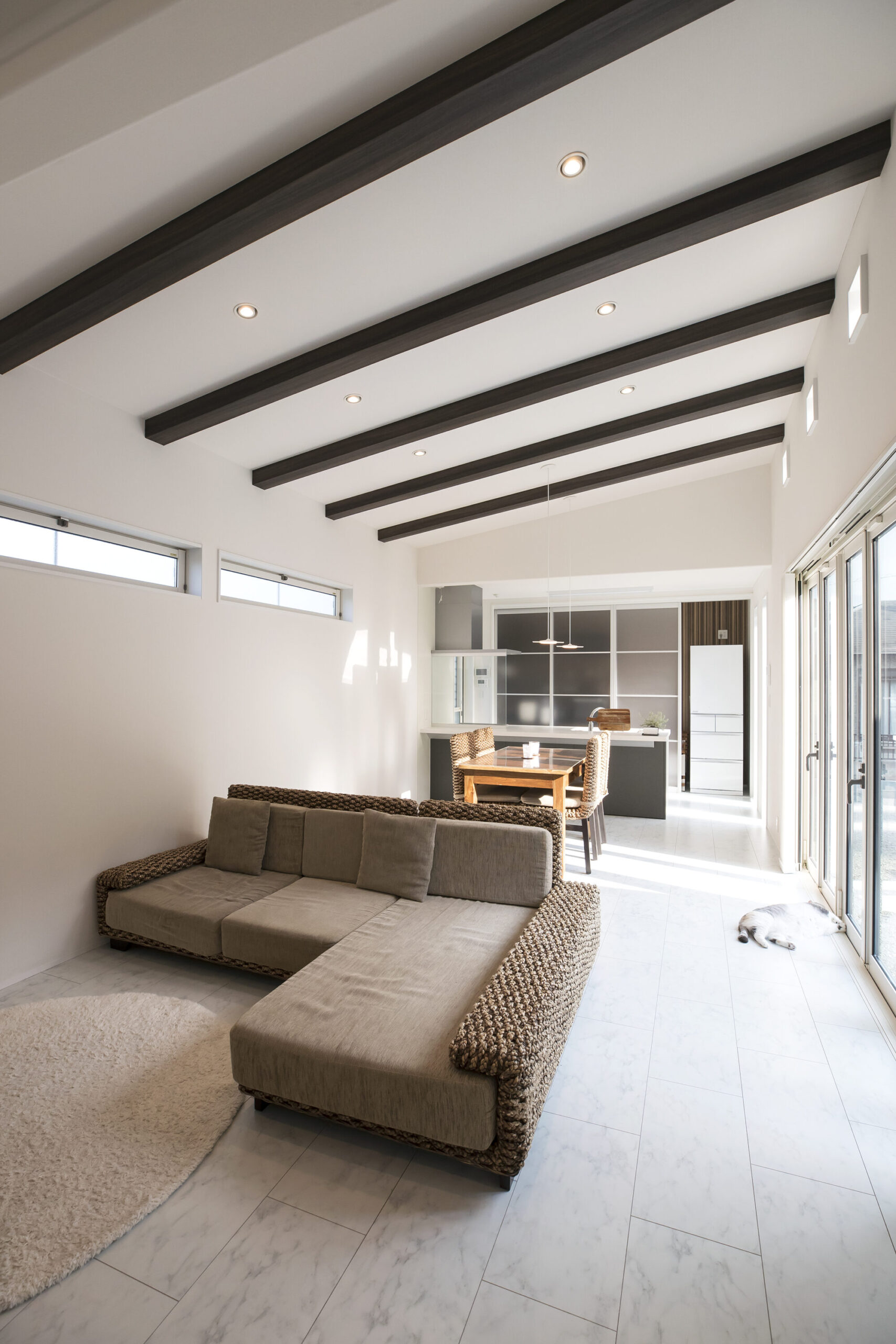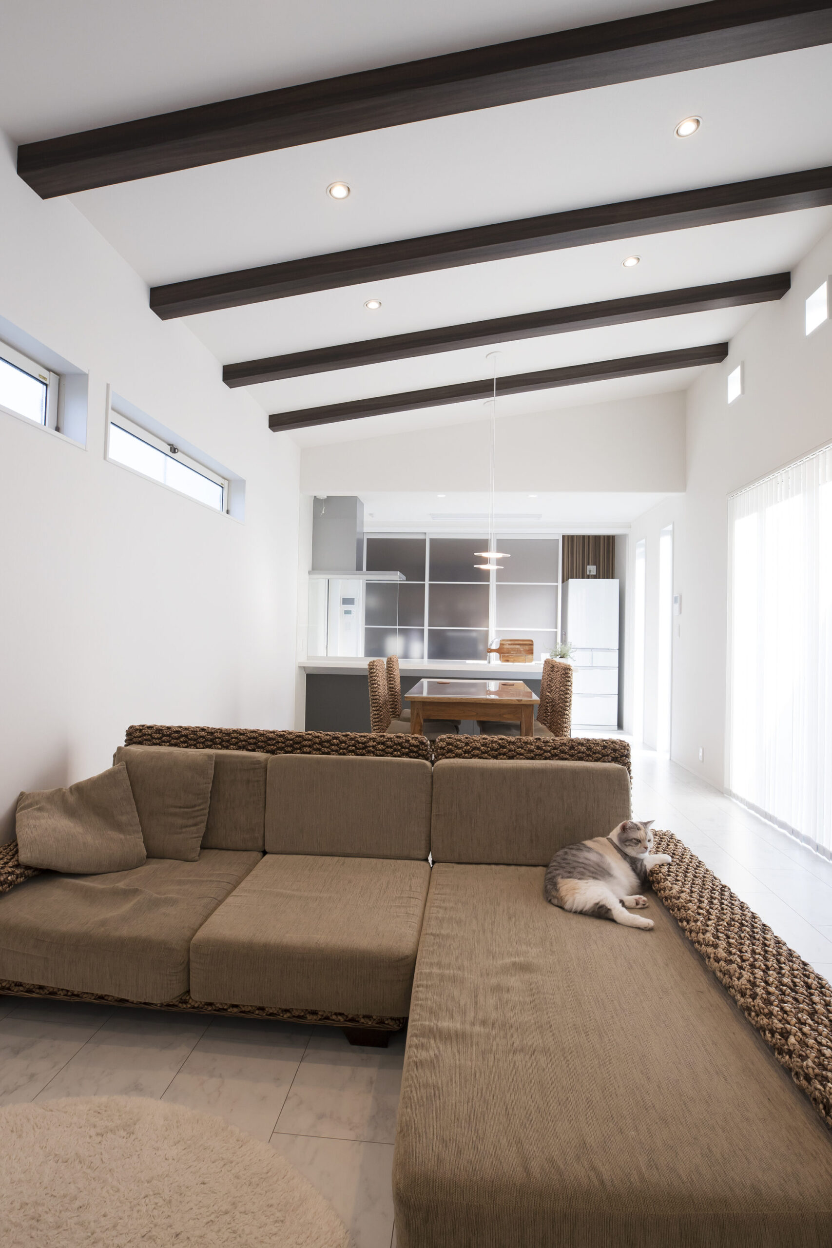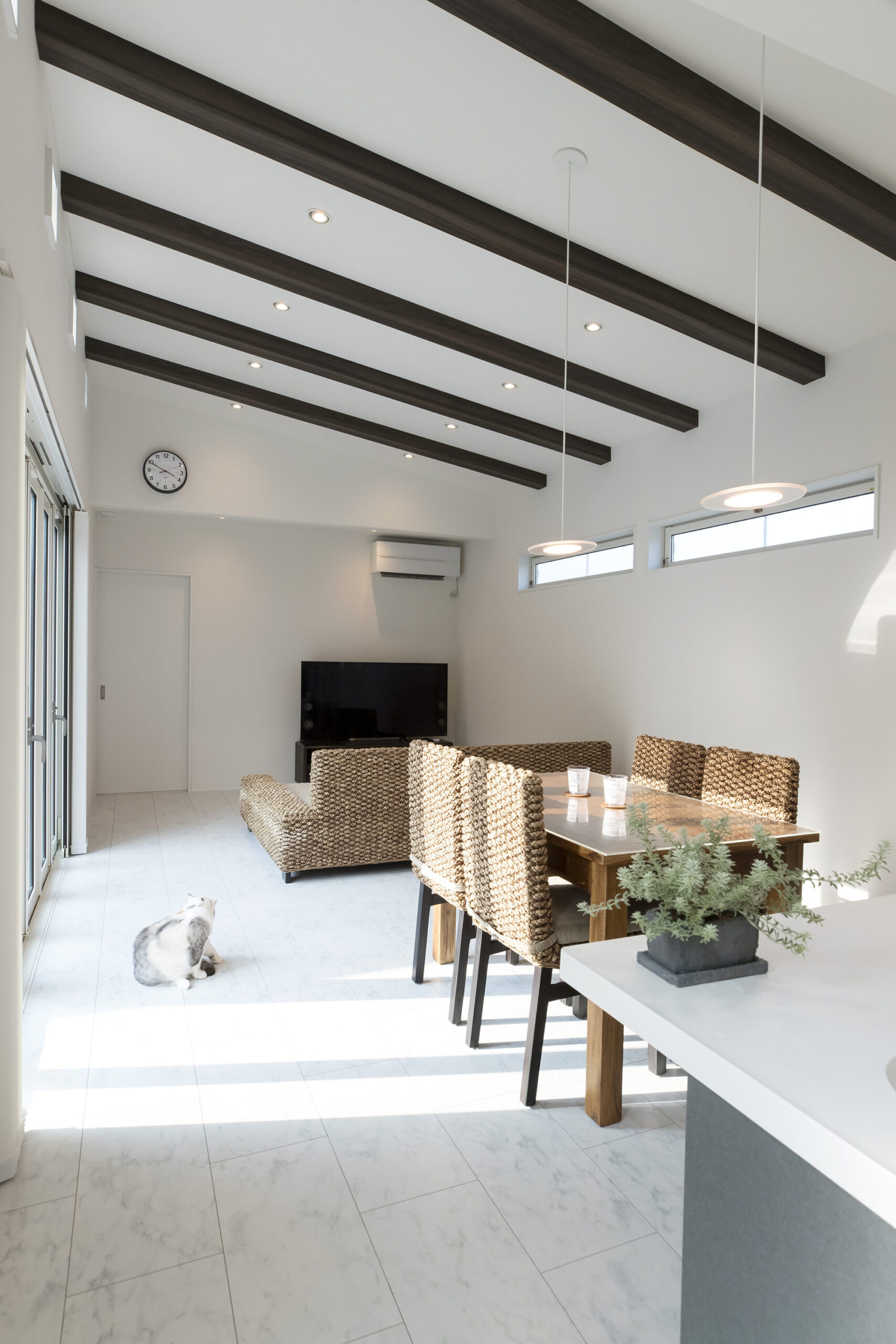 L字の形を利用して、きれいにゾーンニングできました。建物の向かって右手側はLDKのみのパブリックゾーン。三方を外に囲まれ、離れ家のような感覚でぜいたくにくつろげます。猫ちゃんも窓際の心地よさを満喫しているようですね。目を引くのは開放感いっぱいの勾配天井です。梁の黒いラインが緩やかな傾斜を際立たせると同時に、奥行きも感じさせ、広々とした空間をより大きく見せています。下はエレガントな大理石調フロア。高級ホテルのようなラグジュアリーな空間です。