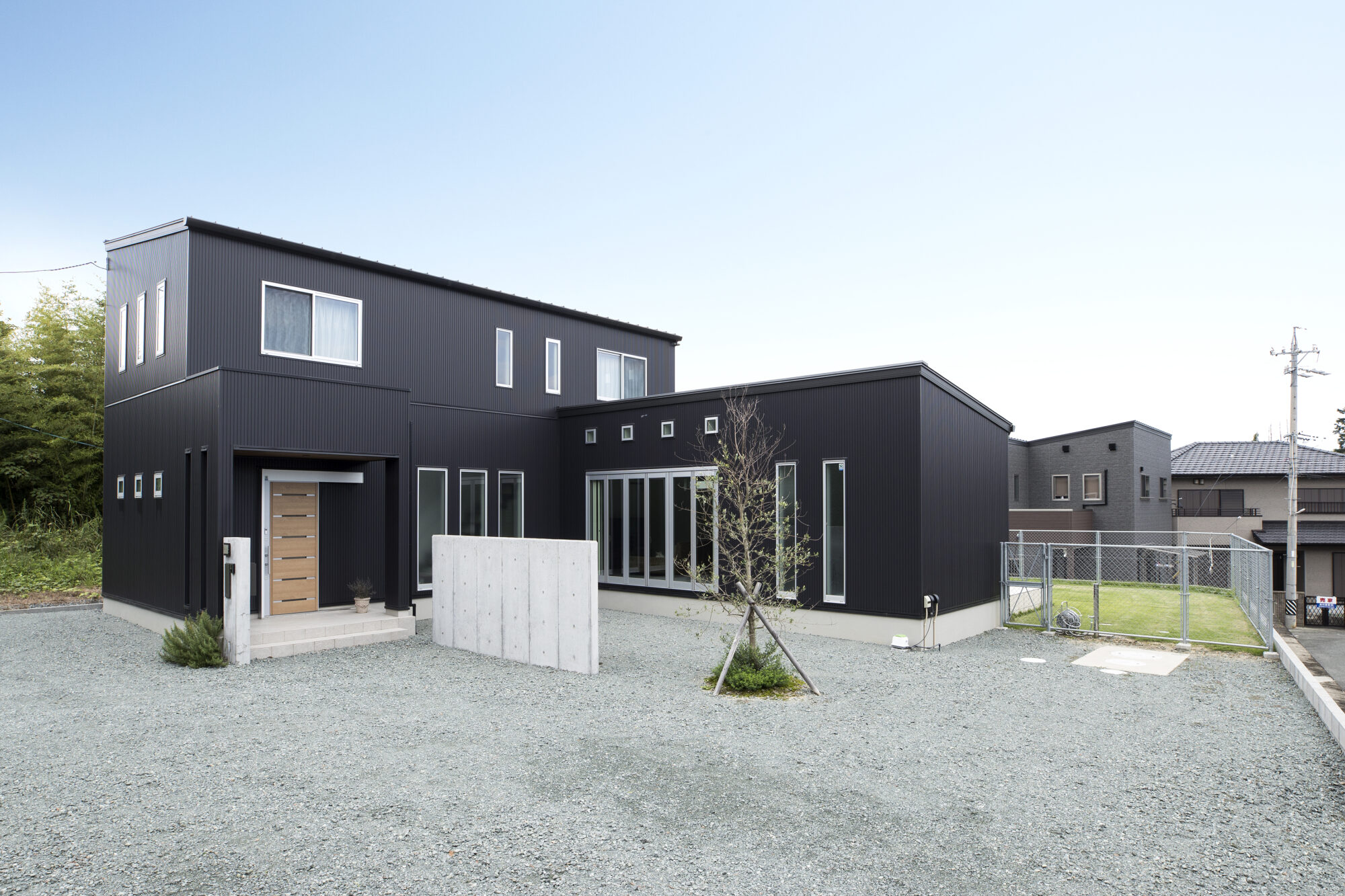 平屋と二階建てをL字に組み合わせました。斜めから見ると、ブラックの両翼を広げた優雅な立ち姿に圧倒されます。黒を背景にした窓の美しさも見事。リビング前のフルオープン窓やダイス型のかわいい高窓など、さまざまな形の窓がリズミカルに並び、躍動感を生み出しています。窓が多い分、屋内が見えないようにコンクリート塀を設置。それにより、コの字に囲まれた部分がプライベートガーデンのようになりました。シンボルツリーが成長したときは、さらにのびのびとくつろげる空間になっていますね。