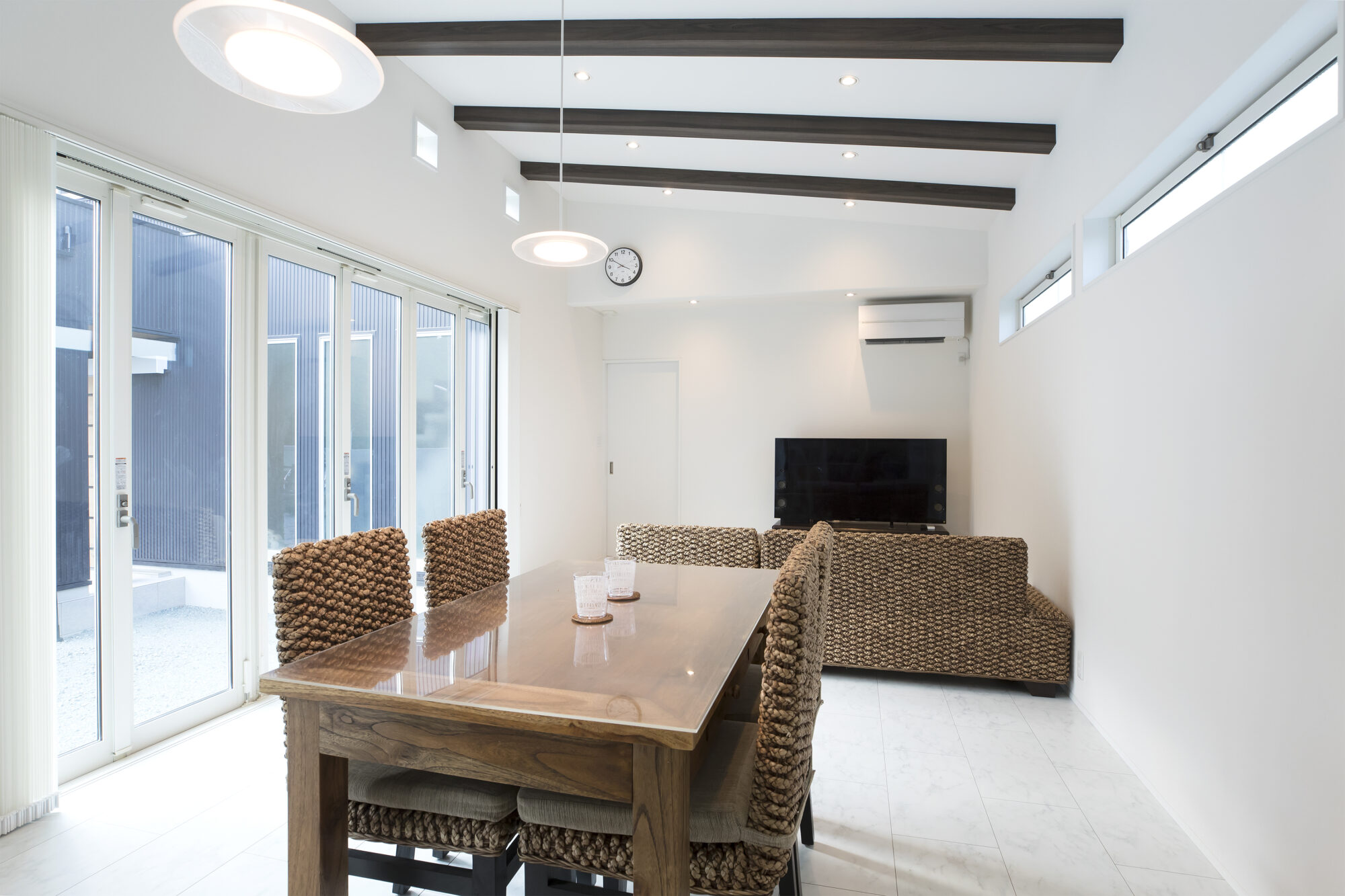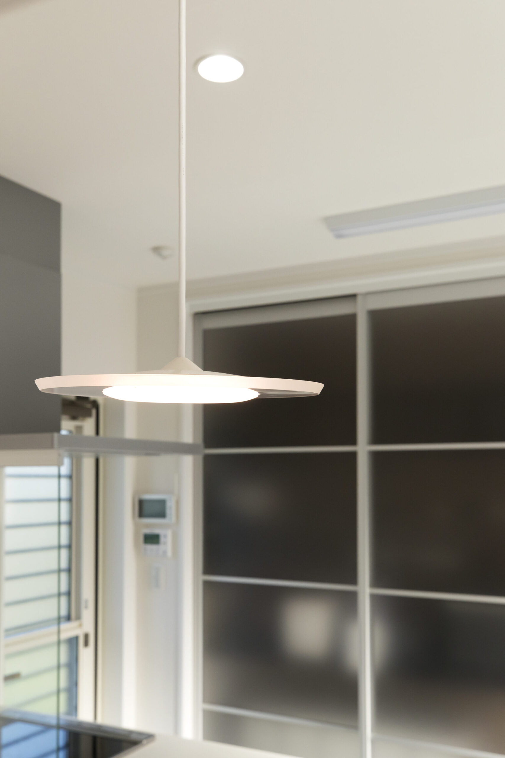 お部屋の雰囲気をおしゃれにしてくれる間接照明。こちらのLDKではダウンライトでスポット的に壁を照らし、ムードのある奥行き感をつくりました。部屋の輪郭も穏やかに浮かび上がり、勾配天井がより美しく見えます。ダイニング側はペンダントライトを吊して雰囲気を変えました。長いコードが天井の高さを強調しています。光源をかなり低い位置まで下げたので、照らされるのはダイニングテーブルのまわりのみ。空間が広ければ広いほど、包み込むような灯りに安らぎを覚えます。