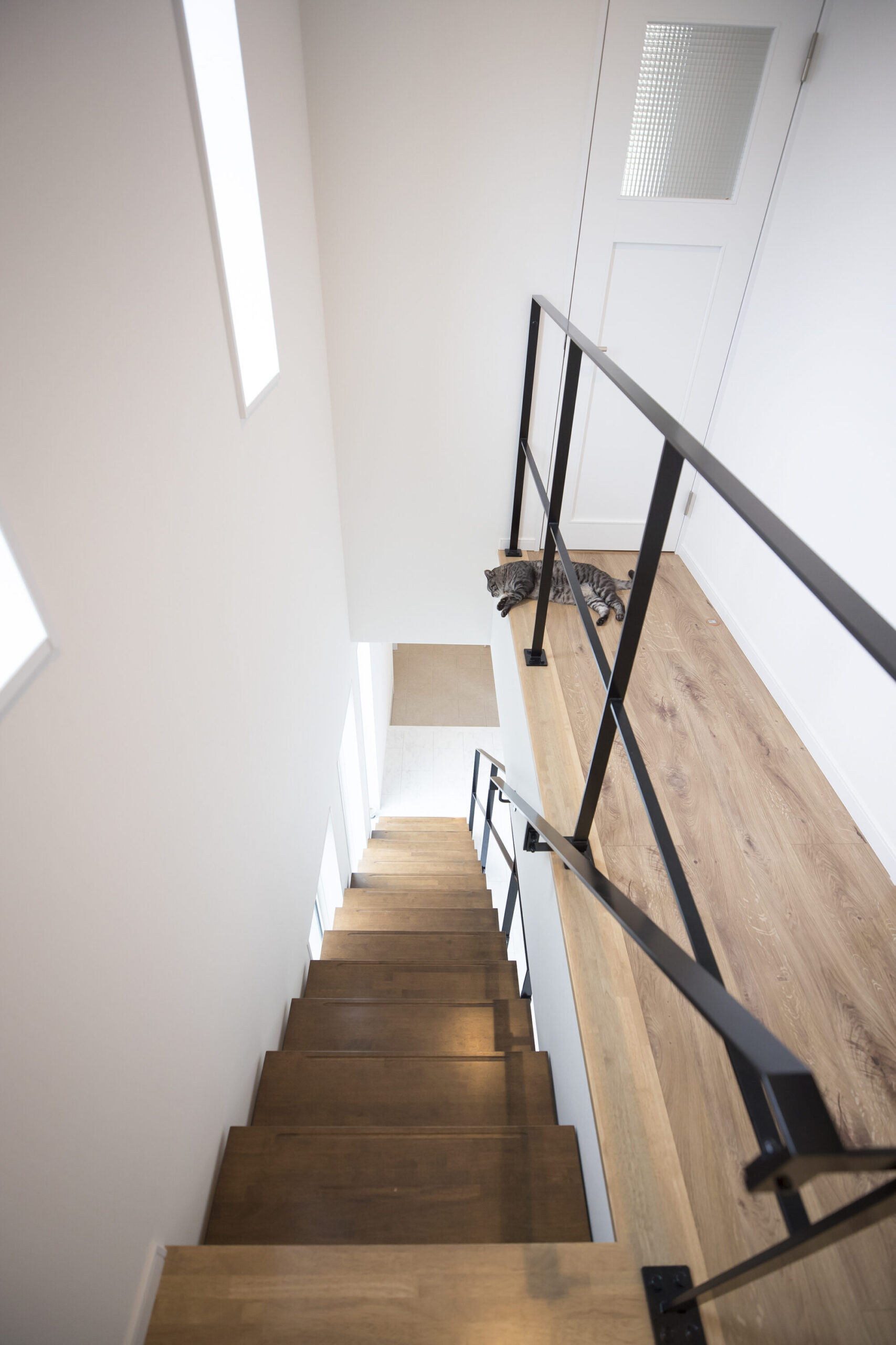建物の向かって左手側は、階段と通路の移動ゾーンと奥様のエステルームです。さまざまな人が行きかう場所を独立させたことで、LDKや2階の居室のプライバシーを確保することができました。この空間の主役はアイアンのオープン階段。白だけの空間をキリッと引き締めています。ストレートタイプなので階段下を自由に使えるのも魅力的。スリット窓から光がたっぷり入るので、お客様をお迎えするディスプレイを置くと見栄えがしそうです。