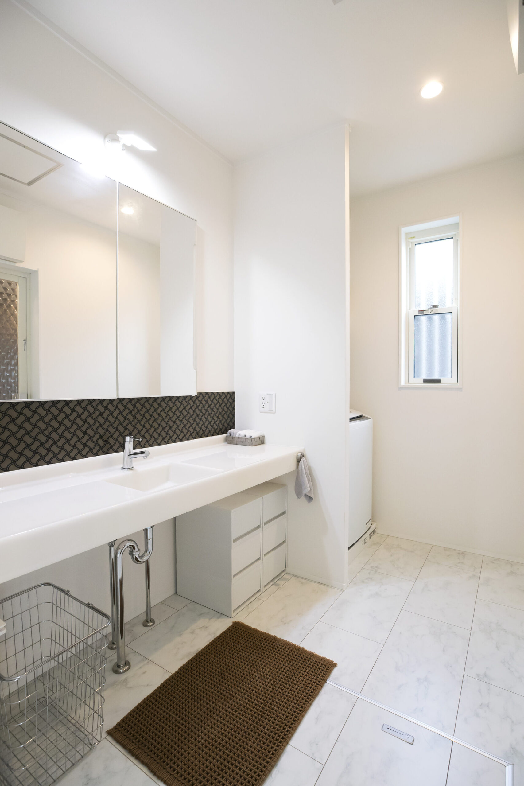 水回りは、L字型建物のコーナー部分に集約しました。LDKに入る前に手洗いとうがいをすませられる便利な場所です。洗面台は、家族が並んで使えるワイドタイプ。シームレスなカウンターなので汚れが溜まりにくく、拭き掃除もラクです。空間のすっきり感を重視してカウンター下はオープンにし、必要な大きさの収納ボックスを置きました。アクセントの黒タイルに描かれているのは「分銅つなぎ」という縁起の良い柄。粋な和紋がスタイリッシュ感を高めています。