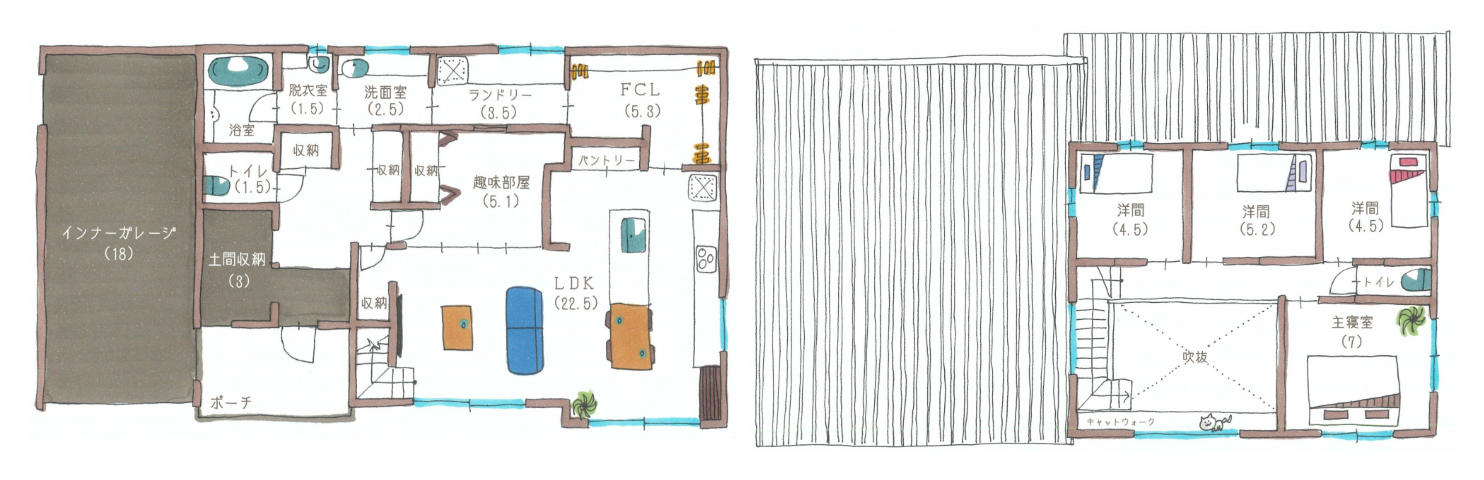 インナーガレージや趣味部屋、22畳の吹き抜けのあるLDKなど、快適な暮らしを実現する斬新な設計が特徴のお家!