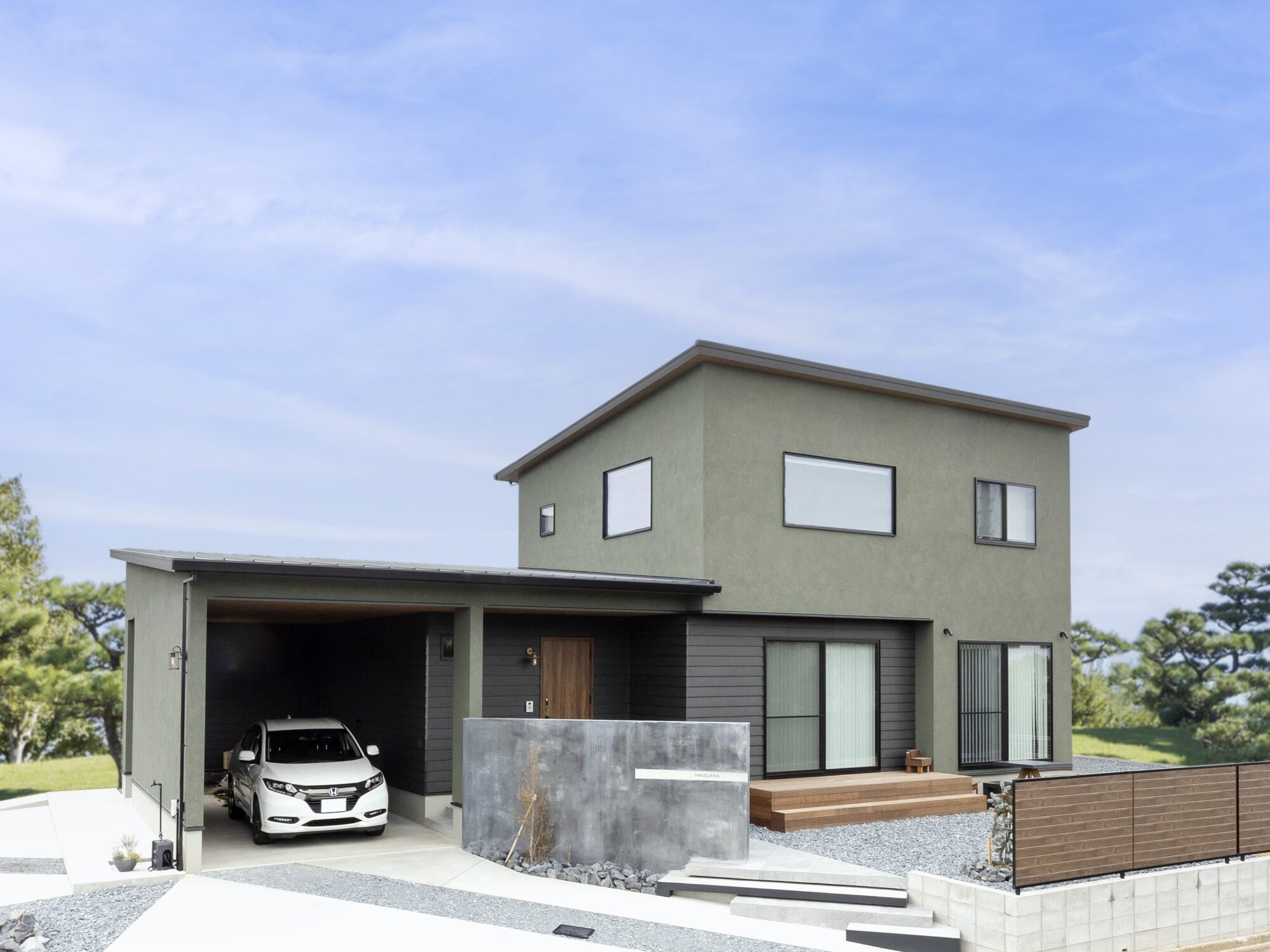 シックなグリーンの塗り壁の外観に、インナーガレージを完備。